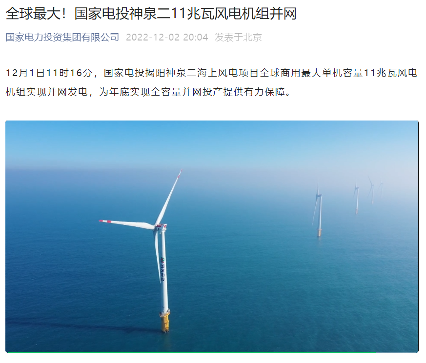 IT之家 12 月 2 日消息,据国家电力投资集团有限公司消息,12 月 1 日 11 时 16 分,国家电投揭阳神泉二海上风电项目全球商用最大单机容量 11 兆瓦风电机组实现并网发电,为年底实现全容量并网投产提供有力保障。