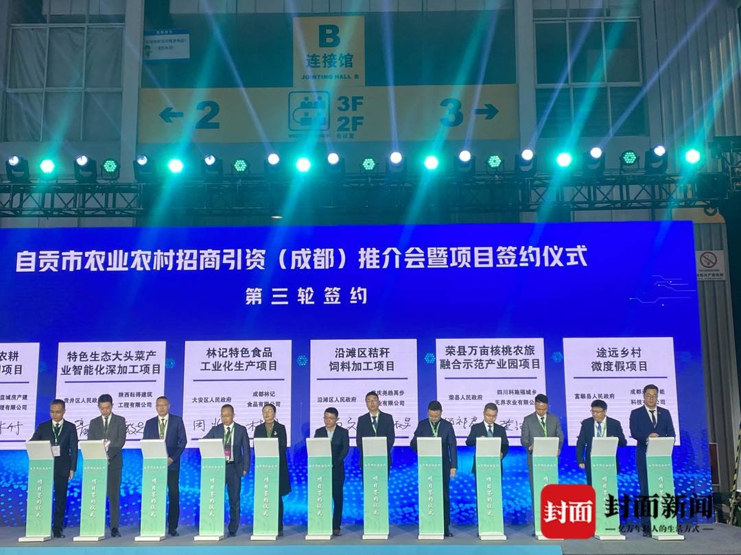 期间,在自贡市农业农村招商引资(成都)推介会暨项目签约仪式上,荣县万亩核桃农旅融合示范产业园、龙都花茶文化科技博览产业园两个项目现场签约。