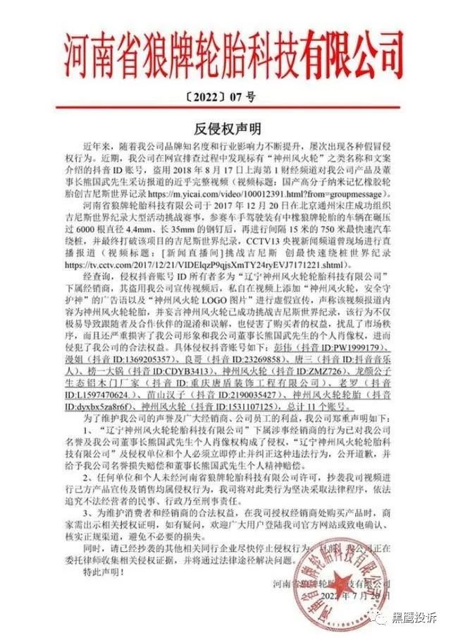 举报人提供了一份7月20日河南省狼牌轮胎科技有限公司发布的反侵权声明显示,神州风火轮下属经销商11个抖音账号盗用该公司的宣传视频后,私自在视频上添加“神州风火轮 安全守护神”的广告语,以及“神州风火轮LOGO”进行虚假、夸大宣传。该公司要求神州风火轮及经销商停止侵权行为,并公开道歉及赔偿损失。