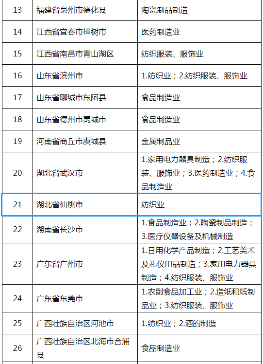 今年,武汉以家用电力器具制造业,纺织服装、服饰业,医药制造业,食品制造业四大优势产业入围,为特色优势产业最多的城市之一,不久前才以无纺布登榜工信部重点培育纺织服装百家品牌的仙桃市,再次以纺织业入围“三品”战略示范城市名单。