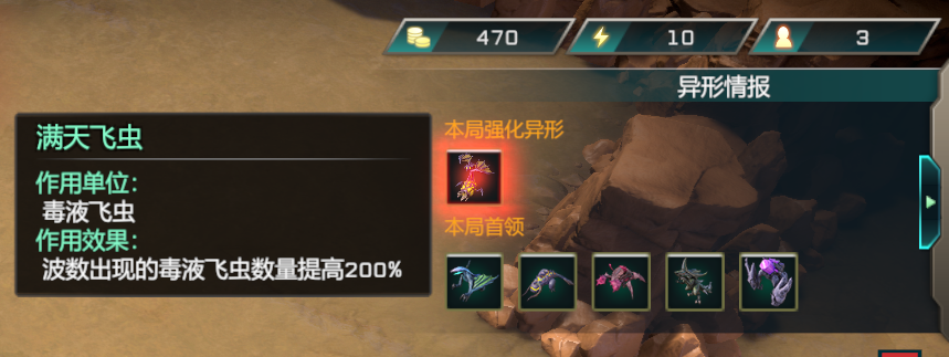 每一局对战开始,玩家就可以通过右上角的波次提示,提前预知虫族在本局对战当中获得的随机buff以及会在对战中出现的高级首领,根据这些来制定本局的作战计划。每一局敌人的种类和获得的buff都是随机的,这也是Rogue的一部分,让你每一局的对战体验都不同~
