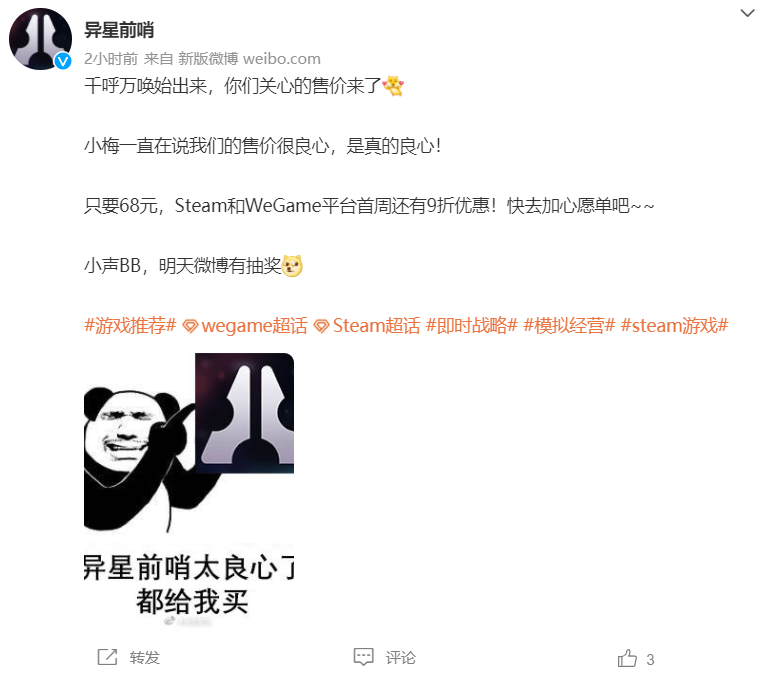 这么亲民友好的国产RTS游戏,你真的不冲一下吗?游戏将于12月16日正式发售,steam和Wegame平台首周更有9折优惠,让你用一顿疯狂星期四的钱,换无数个疯狂星期四的快乐!还等什么,快喊上你的好兄弟们,一起去异星当个快乐的指挥官吧!