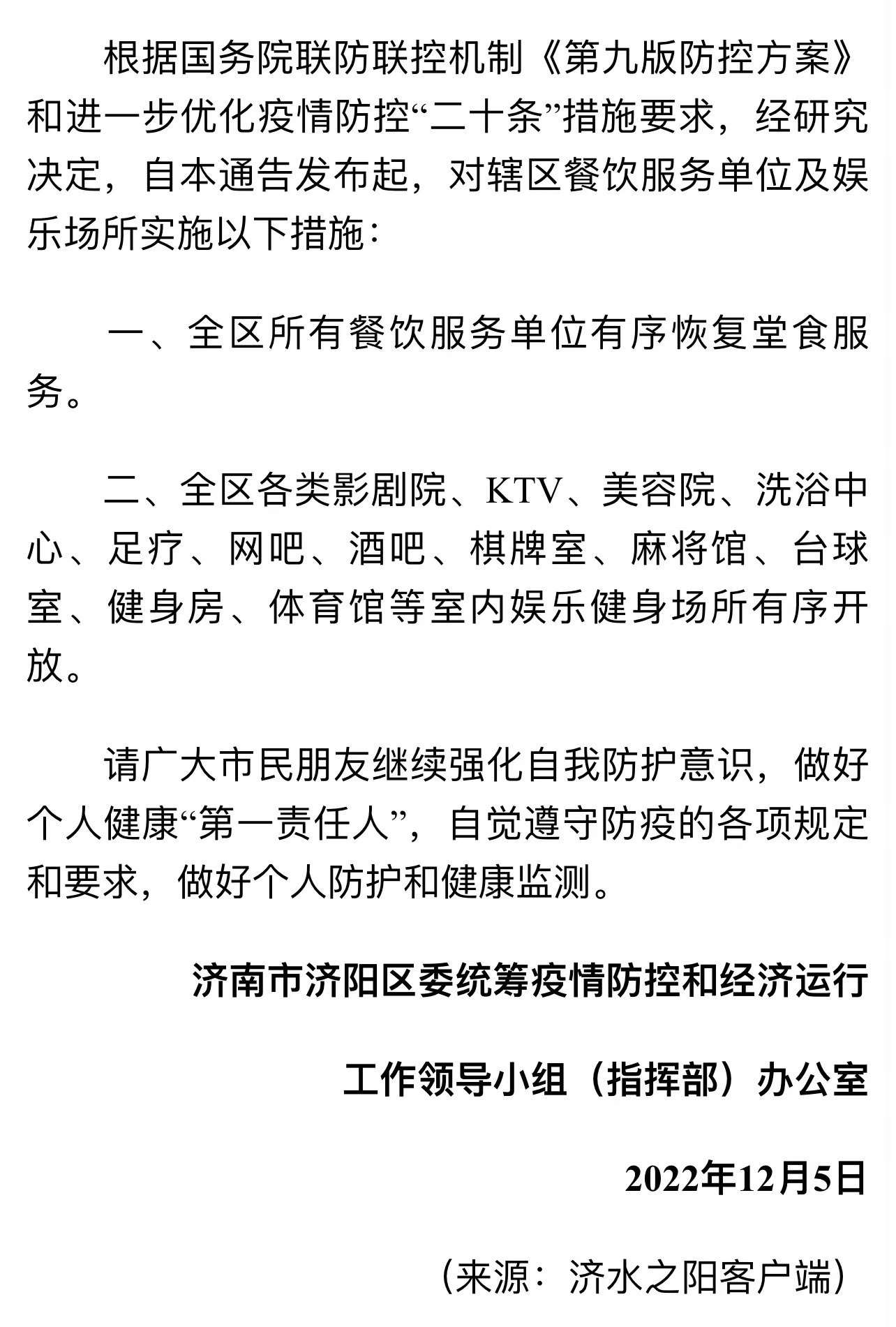 原标题:济阳区发布关于调整有关场所防控措施的通告