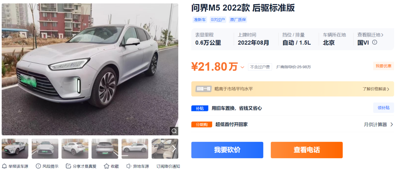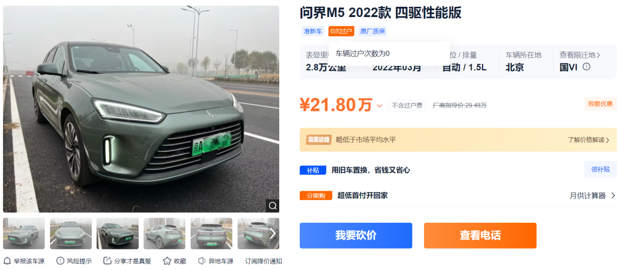 近日某二手网站上出现了两台问界M5车型,都是增程版本的准新车,卖价是21.8万。再来看这台车的新车价格,是25.98万起。这样算来,便宜了4万多元。尤其是其中的一款还是指导价格29.48万级别,上牌9个月,行驶了2.8万公里的四驱性能版。