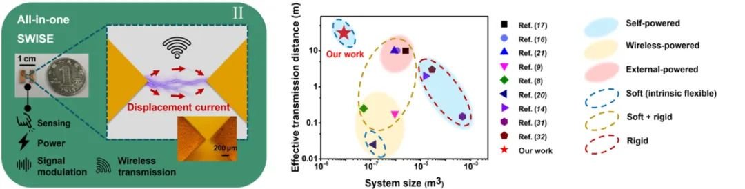 具体地,这项工作提出通过击穿放电引起的位移电流使得电磁波生成和自供能无线传感的范式转变策略,并实现了一体式完全自供能无线传感和传输单元即 SWISE。与最先进的无线传感设备相比,SWISE 具有最小的器件尺寸和最远的有效传输距离(>30 m),并兼具完全自供能及纯柔性的特点。