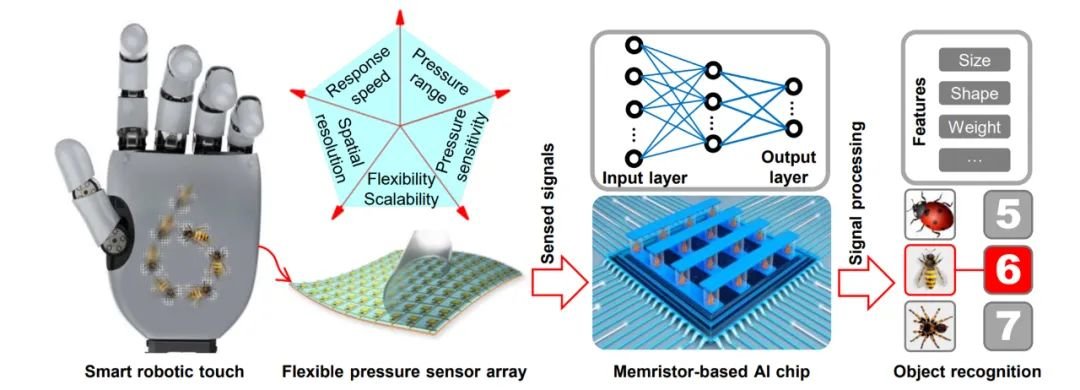 研究者展示了一个 64 × 64 柔性触觉传感器阵列,通过集成高性能压阻膜(PRF)和大面积碳纳米管薄膜晶体管的活性矩阵,实现了 0.9 mm(相当于每英寸 28.2 像素)的高空间分辨率。所研制自组装微结构的压阻薄膜表现出了高达 385 kPa^-1 的高压力灵敏度、3 ms 的快速响应时间、良好的线性度、大于 1400 kPa 的检测范围以及超过 3000 次的良好循环耐久性。集成前两者研制的触觉传感器阵列可以清晰识别仿真蜜蜂的足底图像信号。研究者在硬件上也实现了触觉传感器阵列与基于忆阻器的存算一体芯片相结合的智能触觉系统,记录和识别手写体数字和汉字书法,分类准确率分别达到了 98.8% 和 97.3%。