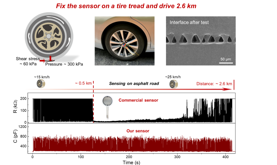 通过在微结构界面引入拓扑交联,该传感器获得了高达~ 390 J·m^-2 的界面韧性和~ 90 kPa 的高剪切强度,在高压、高剪切力模式下均表现出了优异的稳定传感性能。例如,传感器贴附在汽车车胎上(~300 kPa 的压力以及~ 6 kPa 的剪切应力)行驶 2.6 km 后仍然可以正常工作,没有观察到器件的界面破坏。此外,通过在电子皮肤与软体机器人之间构建共融界面,器件在软体抓手不同的抓取场景下都表现出极稳定的传感性能。
