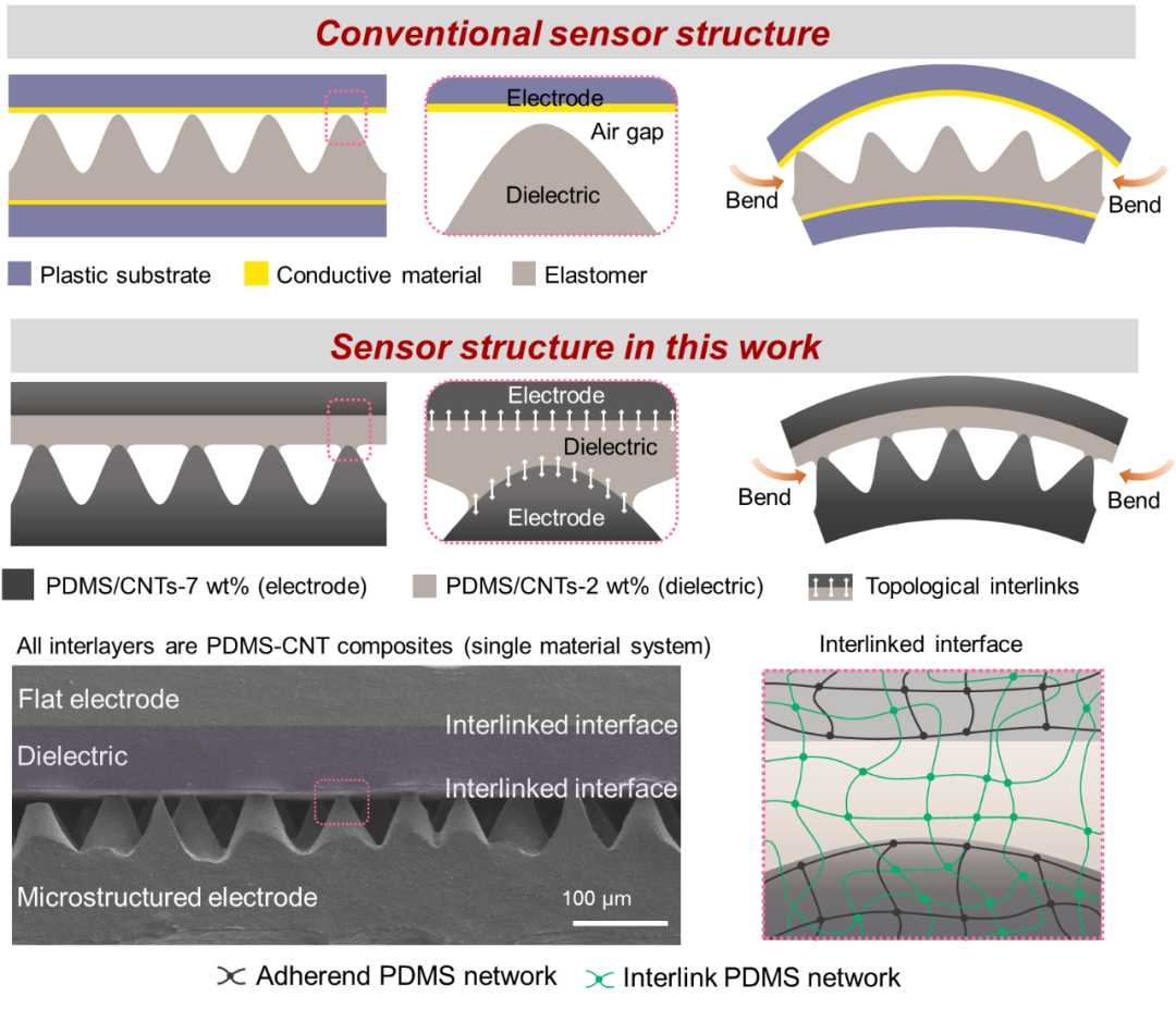 电容传感器具有灵敏度高、响应快、检测限低等优点,已广泛应用在智能穿戴、机器人传感和人机交互等领域。传统的电容传感器大多采用多功能层简单堆叠的异质结构,不同层在材料和弹性模量上差异较大,存在显著的力学失配。因此,具有异质结构、非粘结界面的器件也存在界面不稳定的问题,在高剪切力条件下容易出现界面分层,造成传感信号失真或失效。