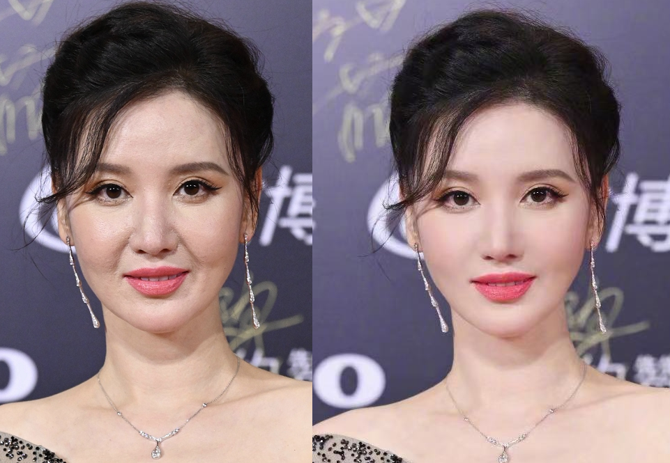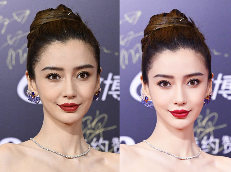红毯王者Angelababy,从生图(左)中可以看到她眉间的痘痘以及轻微的眼袋,此外就没有明显瑕疵了。哪怕镜头怼这么近,她的脸也不显胖,皮肤还是那么好,这样的状态其实不需要精修了。但很多人都喜欢十级美颜的修图风格,所以可以看到修图师把肤色调成亮瞎眼的白,把脸部的阴影都进行了填充,再加上一键磨皮,精修照(右)反而不够自然,但总体差别不大。