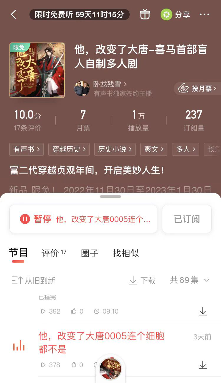 在和平台敲定意向后,刘志伟开始筹备这样一部有声剧,并选中了他当时手上的一本网文版权书籍《他,改变了大唐》。