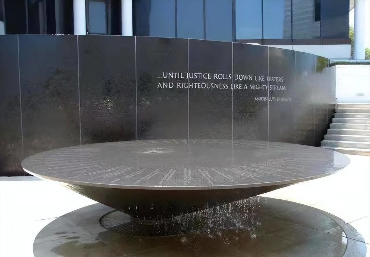 水面平铺在刻有文字的花岗石圆盘上,仿佛静止,只有在参观者轻触水面时,看似不动的水流才会显出波纹;圆盘的底部开有槽隙,水滴洒下,仿佛热泪。