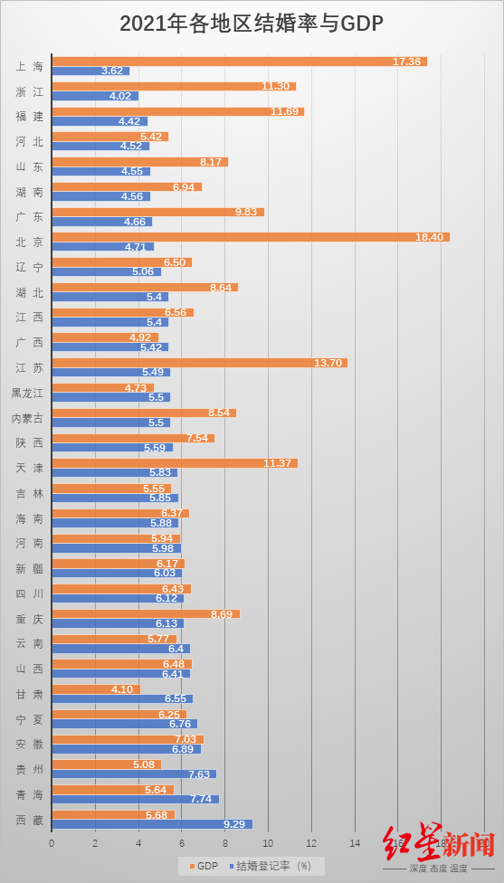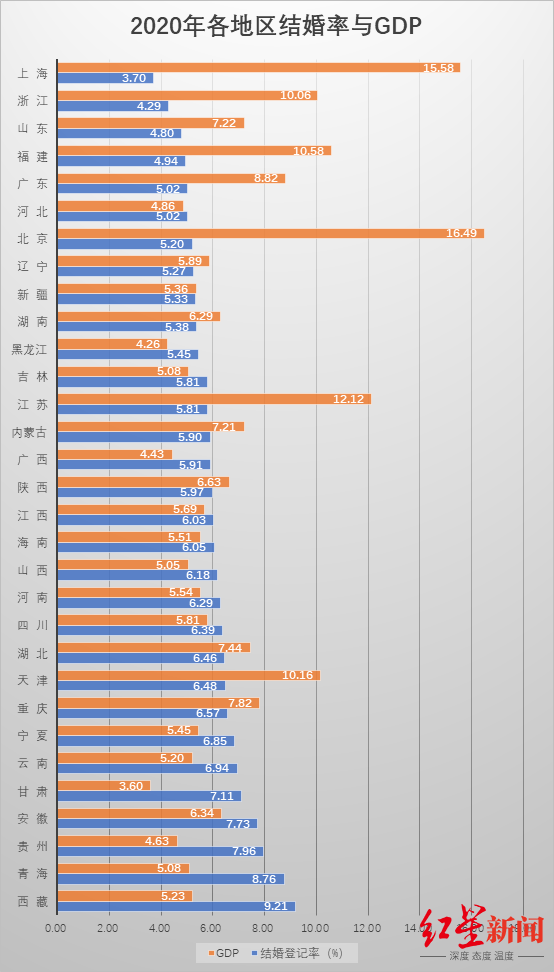 经济原因对“延迟结婚”的选择产生影响,但并非决定性原因,红星新闻记者检索2020年、2021年国家统计局公开发布的分地区年末人口数、结婚登记对数,计算出各地结婚率后与各地GDP数据比较发现,一些经济发达地区出现结婚率低的情形,但总体上,经济发展水平和结婚率并无显性关联。