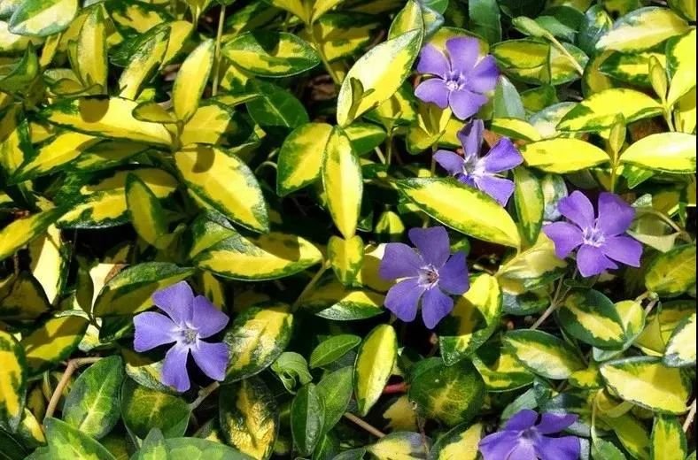 花叶蔓长春是一种匍匐生长的观叶植物,偶尔也能开出一些蓝紫色的花朵。花叶蔓长春比较喜欢常年温润的环境,在偏南地区,常年没有霜冻,它就可以一直露养在户外,已经是布置在花境里。