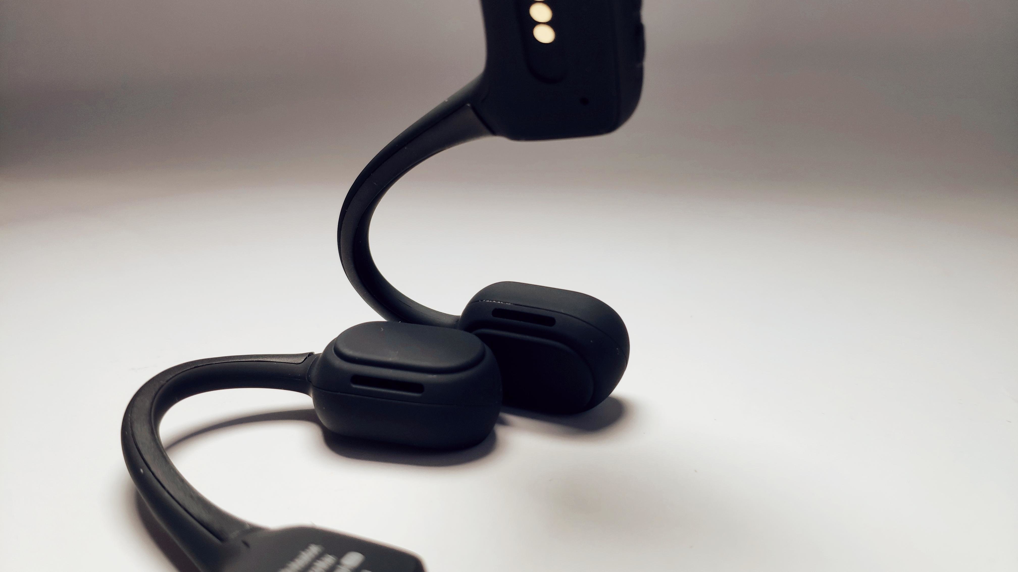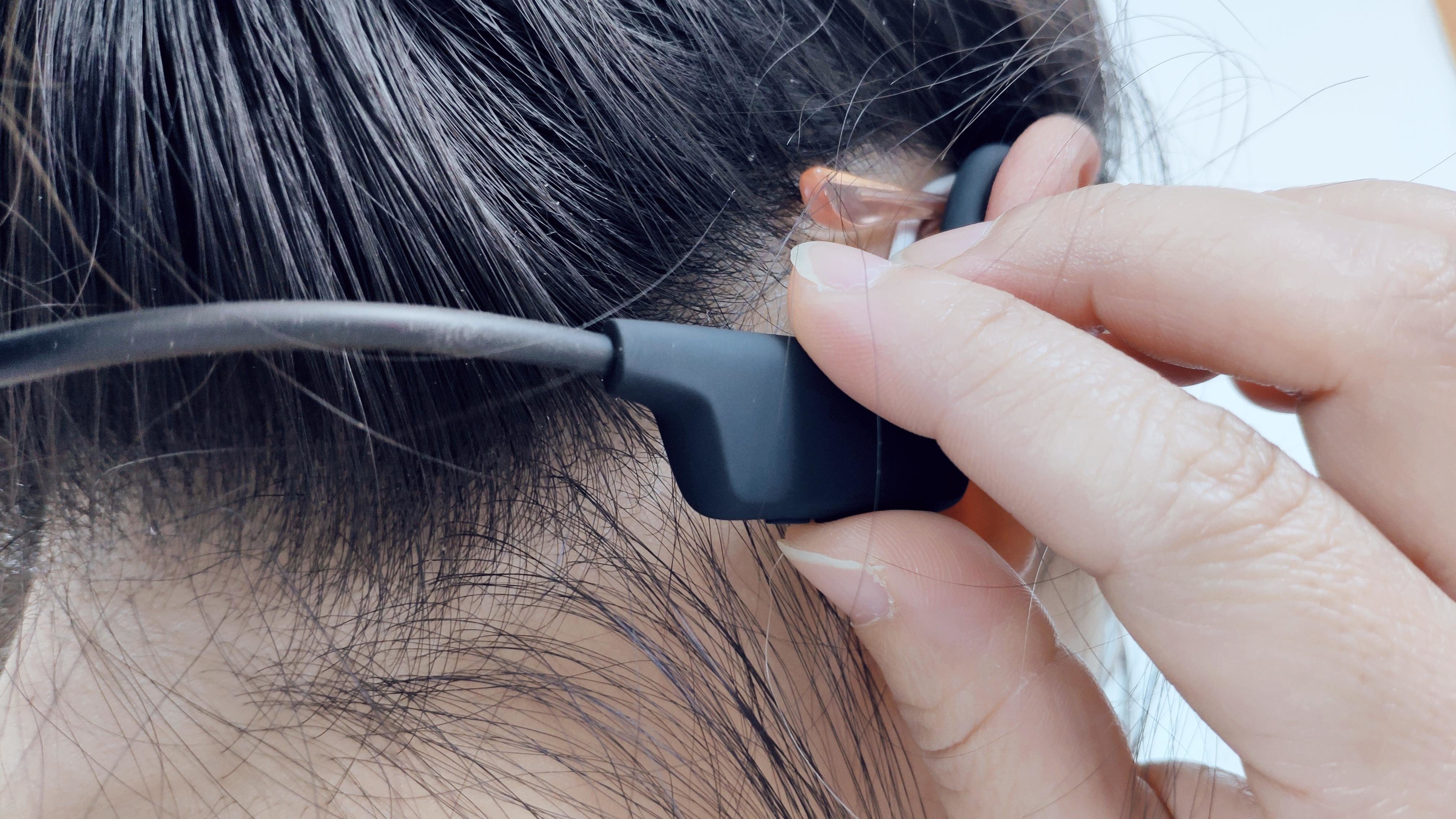整副耳机外观依然是骨传导耳机耳挂式设计,黄金三角佩戴舒适,这种结构完美结合人体头部耳朵和轮廓,佩戴时不夹紧不松垮,运动时不会轻易松掉亦不会在运动或者大热天出汗难受,整副耳机重量仅为25g,这种量虽然谈不上无感佩戴吧,但轻量化的外观方案还是看得懂设计心思的。