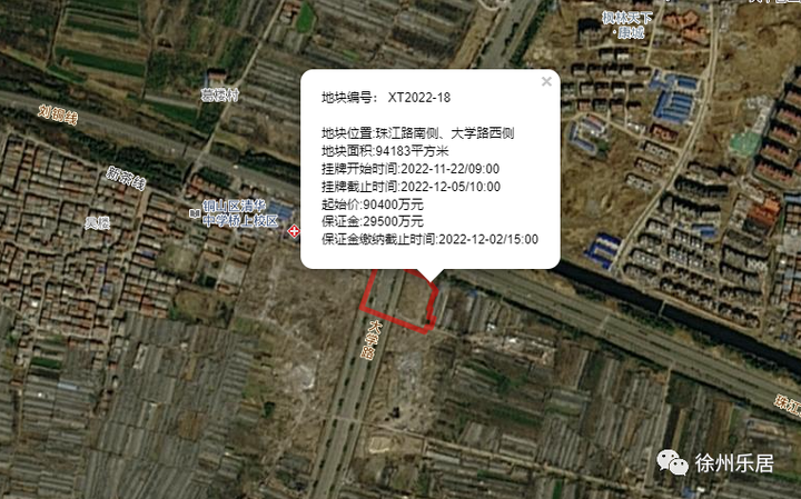 XT2022-18珠江路南侧、大学路西侧地块地块位置:珠江路南侧、大学路西侧土地面积:94183㎡土地用途:A区:城镇住宅81887㎡、B区:商服12296㎡起拍楼面价:4415元/㎡竞得房企:铜山城投