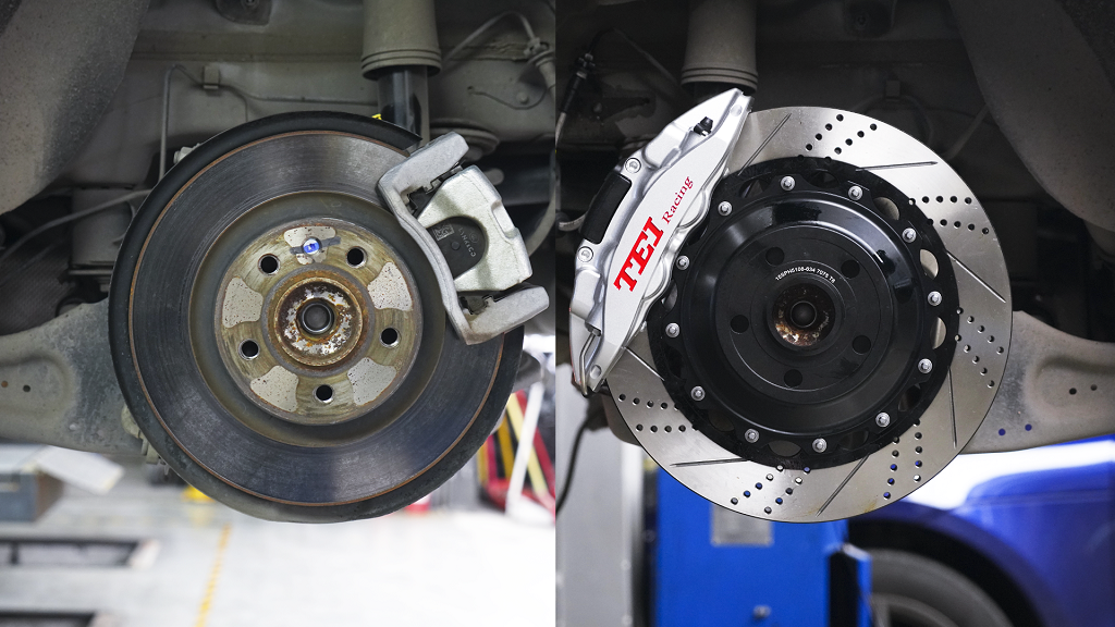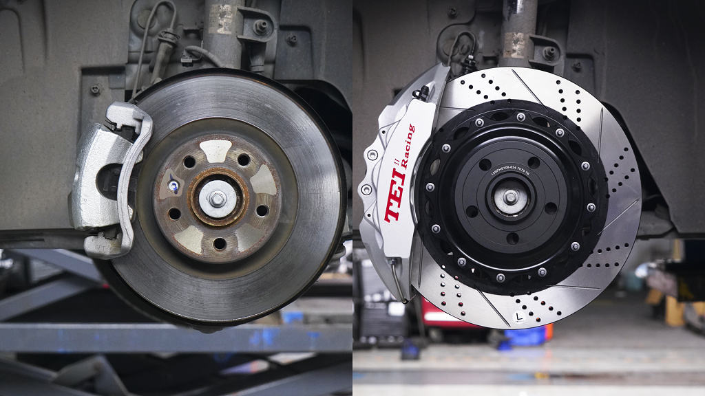 前轮装P60ES是属于入门级的街道版六活塞刹车套件,主打线性舒适脚感,可以匹配市面上大部分3.0T以下车型的原厂总泵;适合18寸轮及以上的轮毂,搭配355 / 378*32mm高碳热处理碟盘,大大提升制动力臂;消除了大家对于刹车行程长脚感偏软的疑虑。