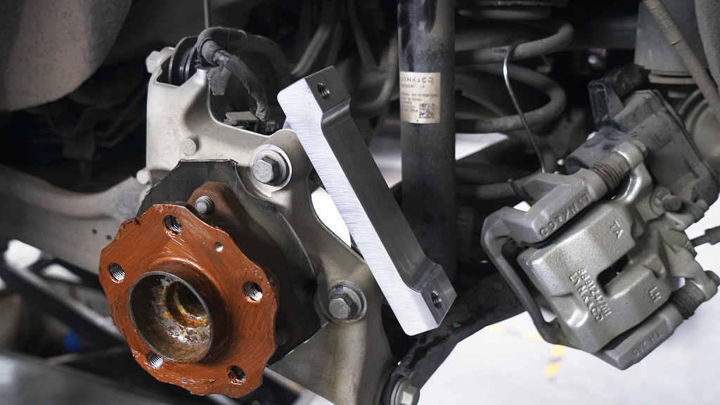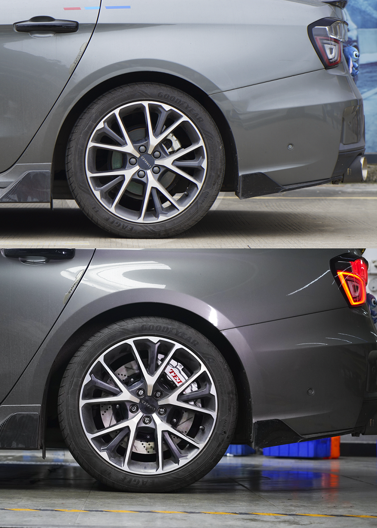 领克03前后原厂刹车仅配单活塞浮动式卡钳,车主反馈前段脚感偏软,轻点刹车基本是没刹车感;18寸轮毂原装前296mm后280mm实心碟盘显得空空荡荡,不论是性能还是颜值车主都不满意,于是找我们升级前6后4刹车套件。让制动力分配上更加均匀,更线性!