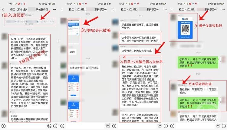 第二天一早,看到消息的家长们觉得事有蹊跷,便打电话给班主任老师和英语老师核实情况,果然,两位老师都表示对此不知情。家长们意识到应该是有人冒充英语老师来行骗,于是连忙报警。