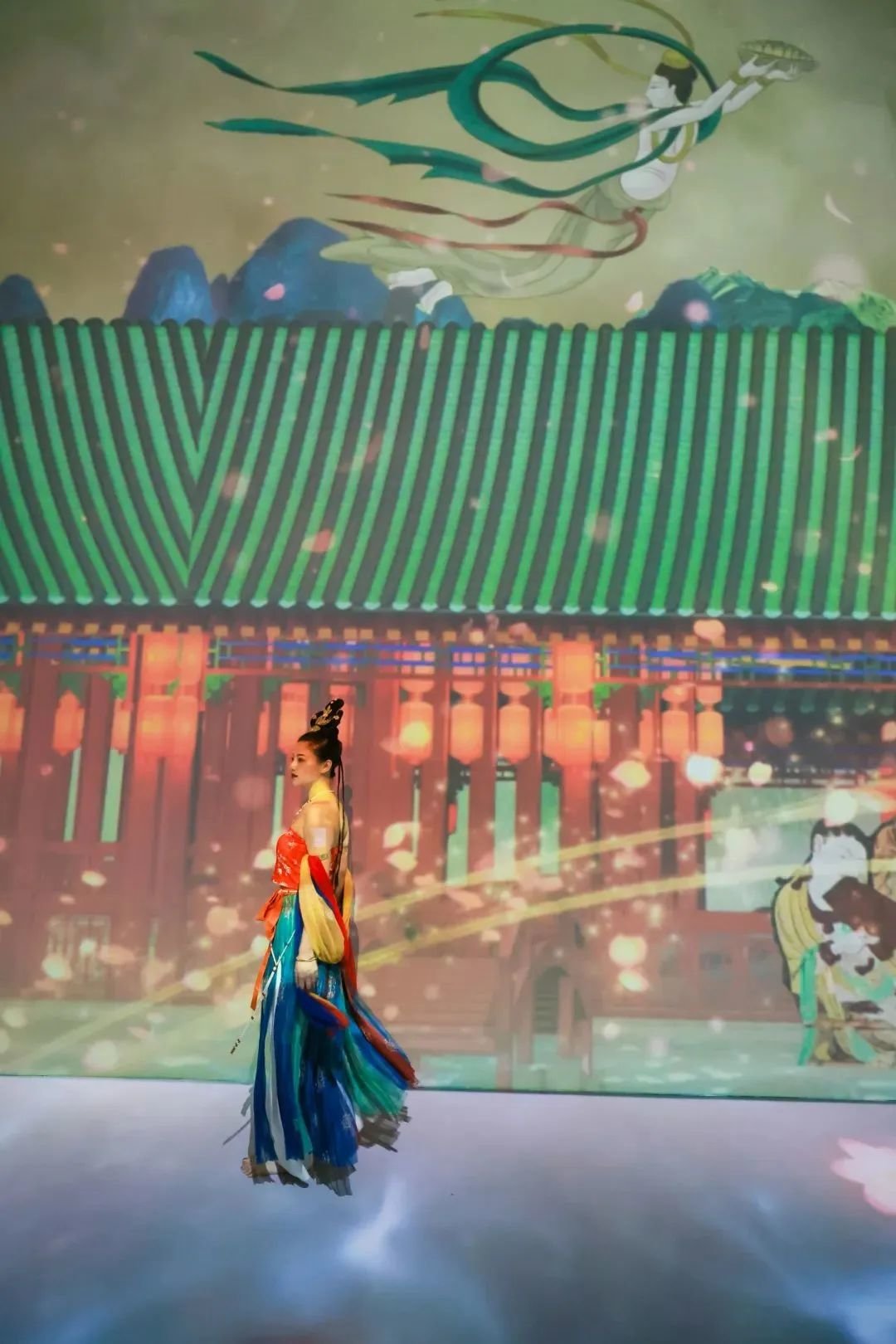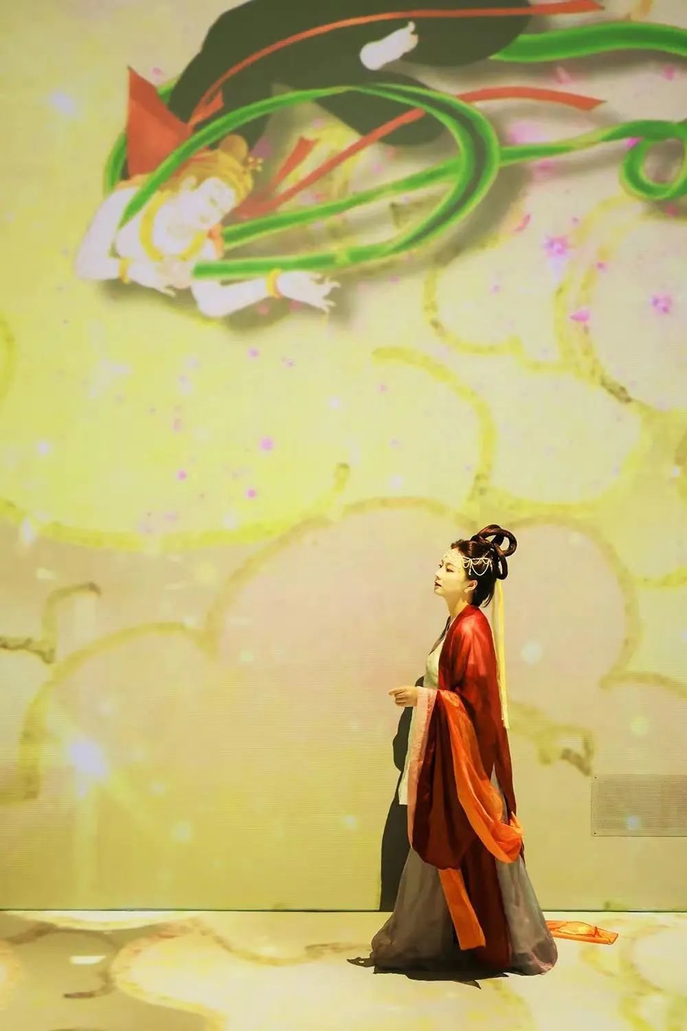 在本次展览“敦煌舞乐”单元中,以《观无量寿经变图》中的反弹琵琶等敦煌经典元素为原型,选取“伎乐飞天”等飞天文化打造了欢乐祥和的舞乐场景。