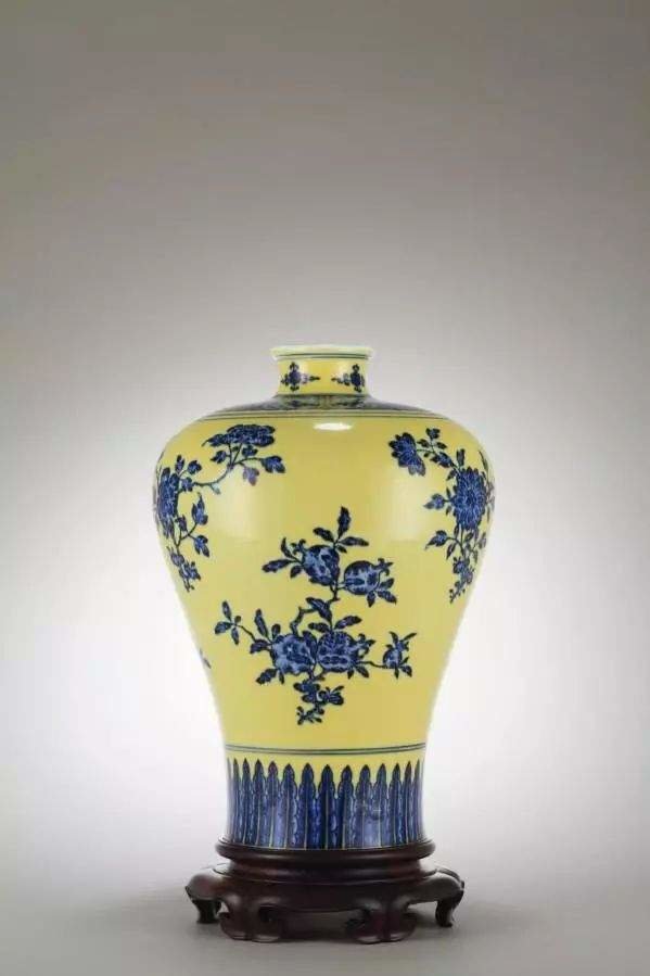 这种釉彩工艺自明宣德创烧,清康熙时继续烧造,并成为康雍乾三代瓷器文物的重要品种。其中尤以雍正青花黄釉文物最为新颖,青花多仿明永、宣时的晕散浓厚铁斑的苏麻离青艺术效果。乾隆时期黄釉青花文物更为多见,这与当时的督陶官唐英的努力是分不开的。民国时,黄地青花瓷器制品较一般青花瓷文物更为昂贵,当时古玩市面上出现了在宣德青花瓷上后挂黄釉以牟利的现象。