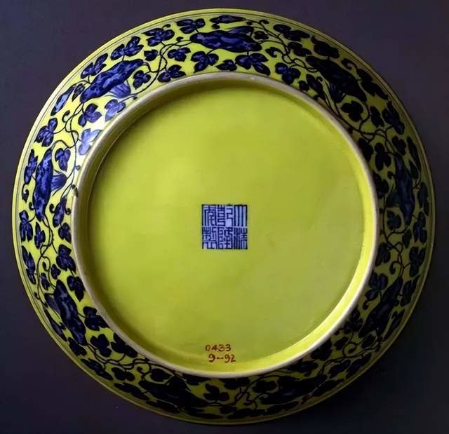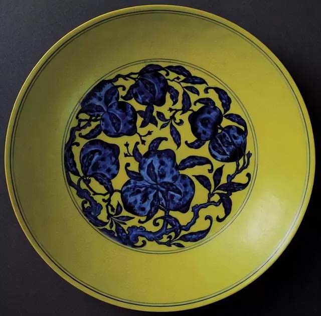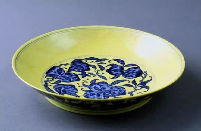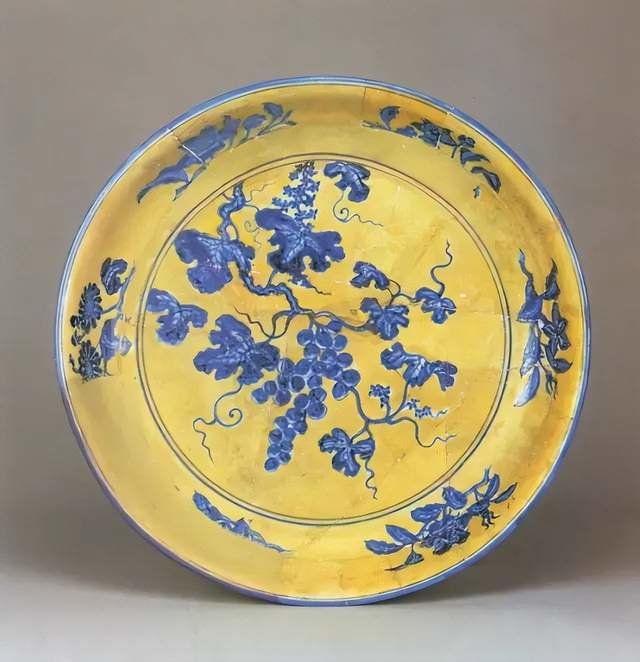 景德镇御窑厂出土明宣德黄地青花葡萄纹盘