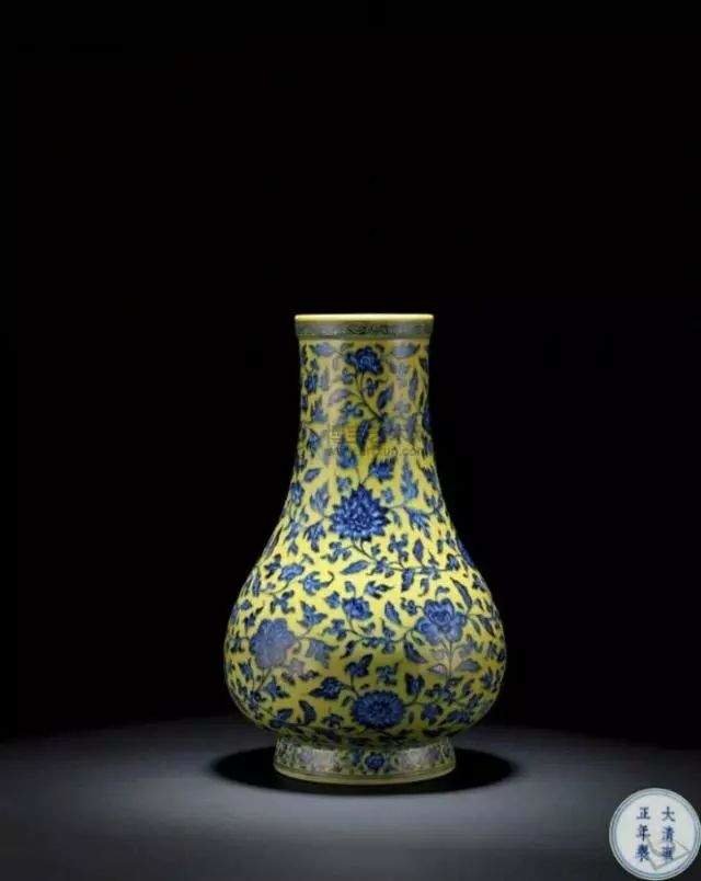 清《南窑笔记》载曰“宣德有青花填黄地者”即指此工艺。以后明各朝均有烧造,以成化、弘治两朝烧制量为大。清代康熙、雍正朝沿袭烧制黄地青花,器形纹饰更加丰富,此时的官窑青花器中尤以青花黄彩也就是黄地青花瓷器最为名贵。《匋雅》卷上有评“黄地青花,雍正窑之所重视者,匪独盘然也,大瓶亦有之。”