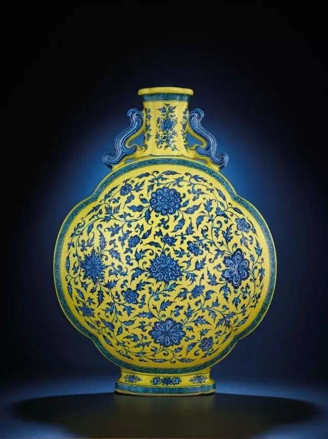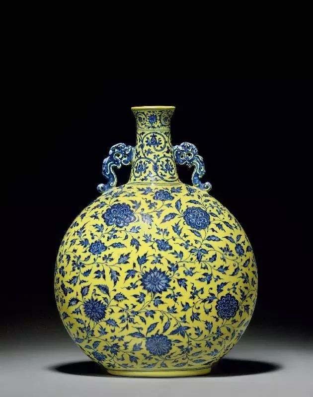 黄地青花瓷器始创于明宣德朝,是低温黄釉与高温釉下彩青花瓷工艺相结合的产物。其制作方法为在已烧成的白地青花瓷器上,在白釉处以低温黄釉填满,复入红炉经850℃-900℃低温烘烤而成。