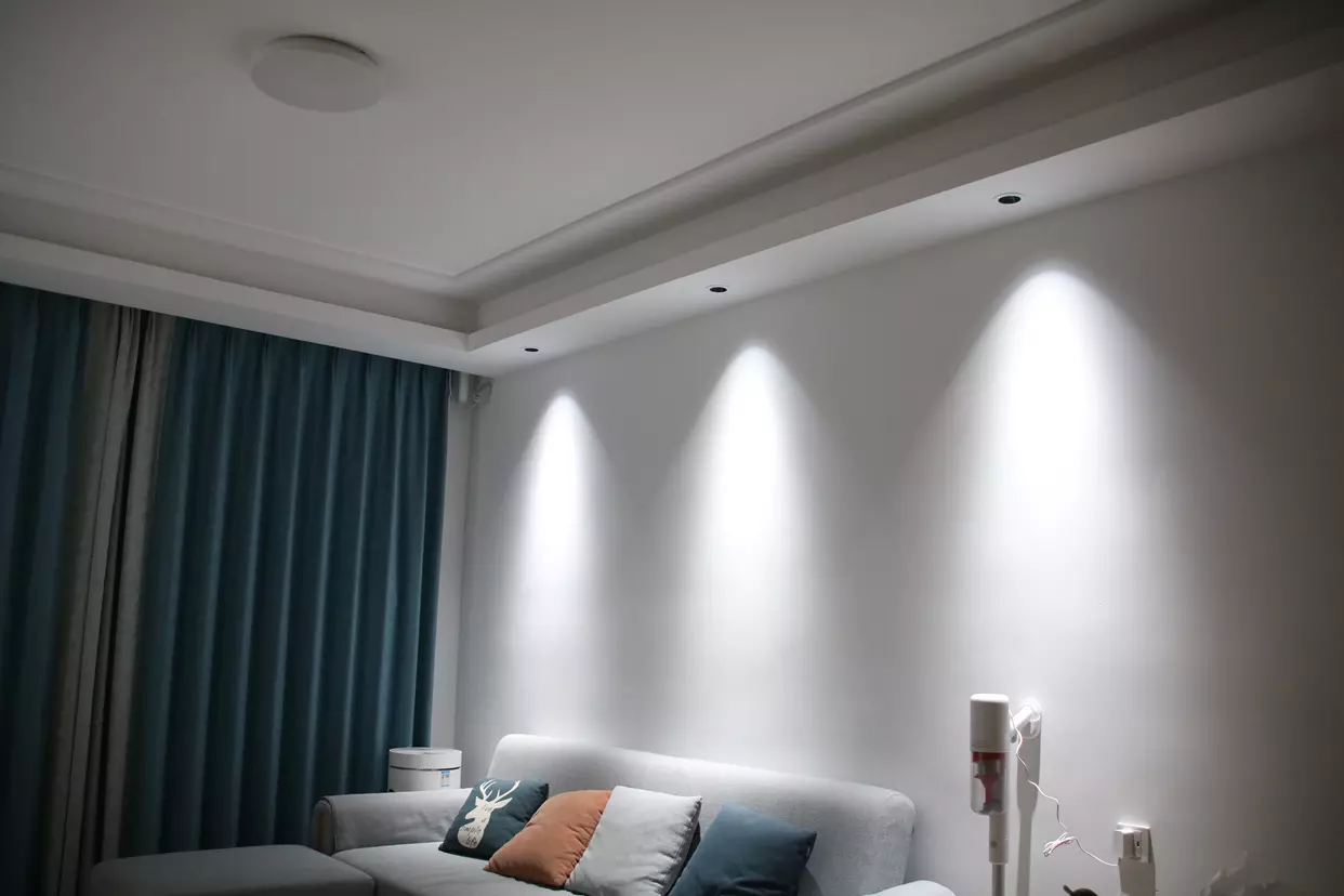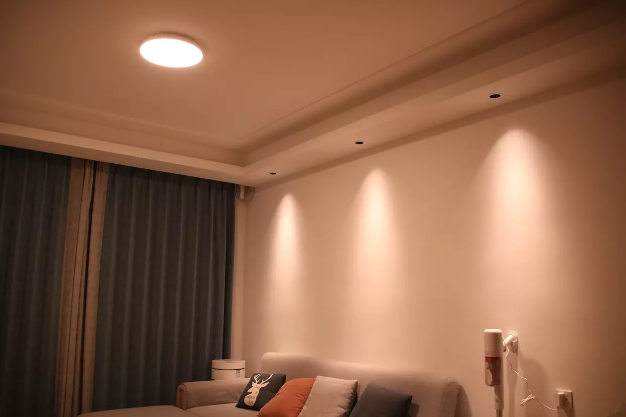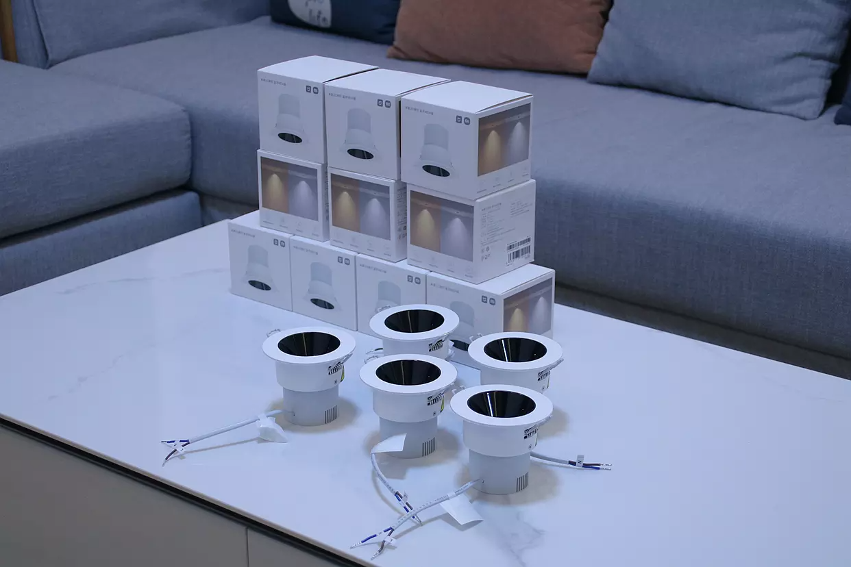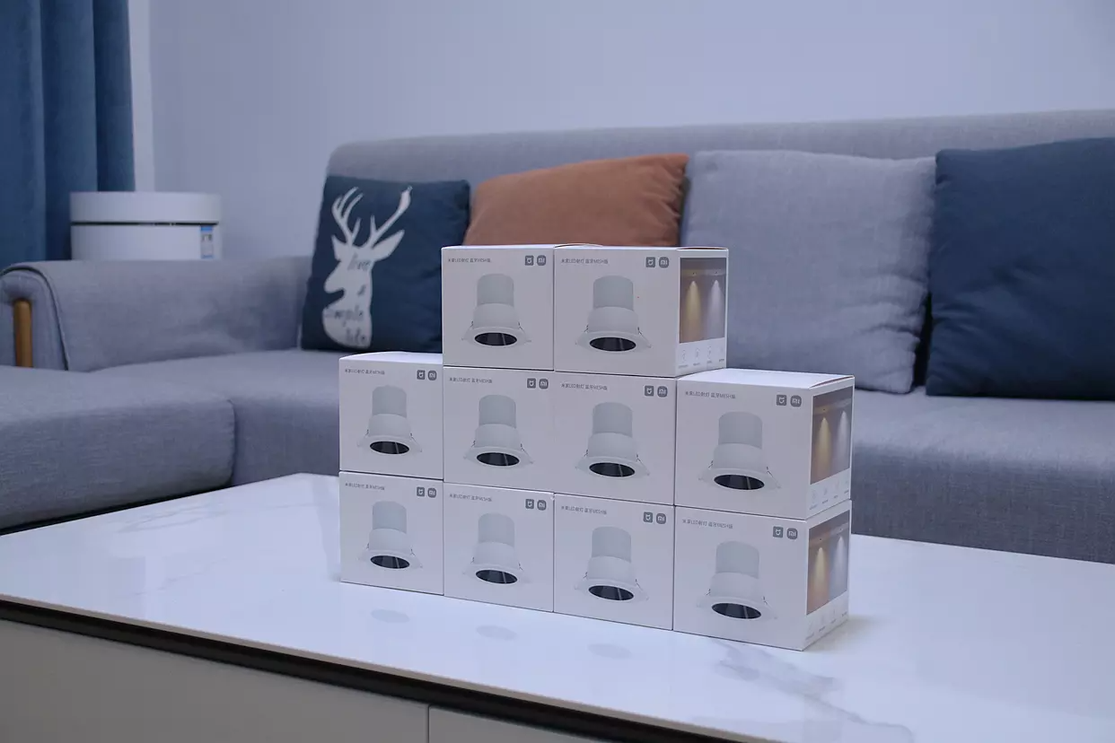 最近这两年装修风格又换了,很多人偏爱那种无主灯式的极简设计,只需在墙面开一些75-80mm圆孔装上筒灯或者射灯,另外在搭配一组灯带就可以了,即使是有主灯设计的新房,针对那种有吊顶装修风格房间,也会在吊顶处安装筒灯、射灯这一类的灯具,我的新房交付后一直对开发商安装的筒灯不满意,自从住进去了,每次使用客厅的筒灯总感觉它的亮度开了跟没开一样,这次我一口气买了10个米家LED射灯 蓝牙MESH版,把开发商的劣质筒灯全部替换掉了。
