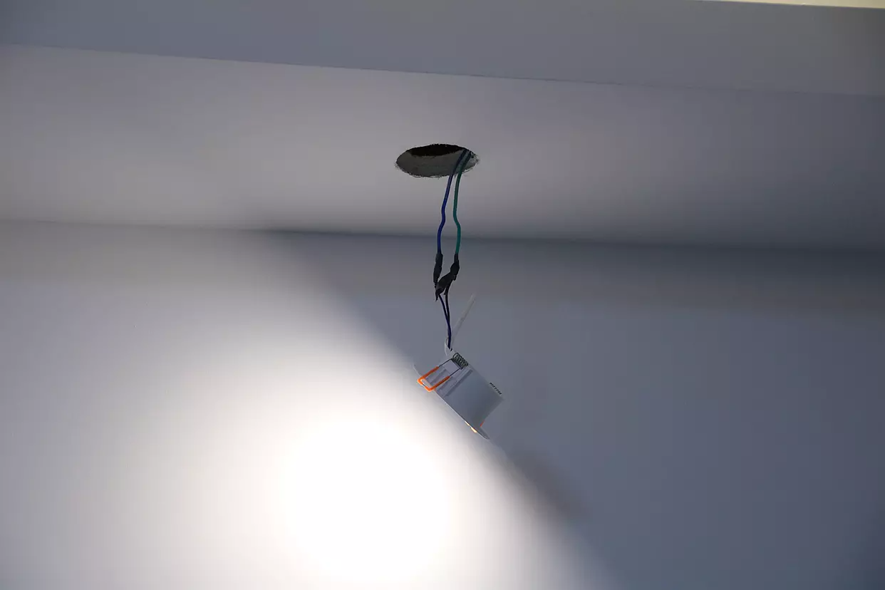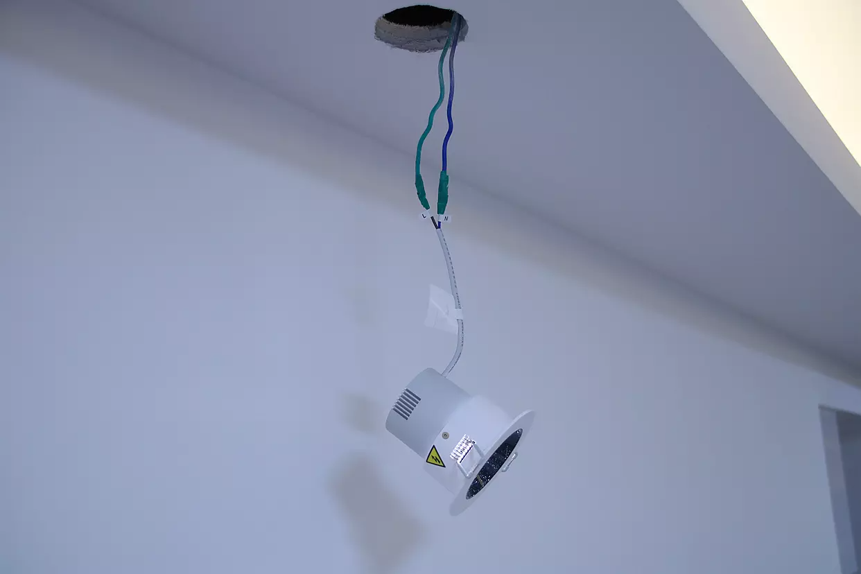安装米家LED射灯 蓝牙MESH版的第一要素就是家里的天花板上有75-80mm的开孔,像我家里之前装的有筒灯,直接把它取下来就行了,然后用试电笔测一下哪根是火线,然后关掉家里的电闸,将火线与米家LED射灯 蓝牙MESH版的火线连接,零线与射灯的零线连接,用电工胶带包好就搞定了。
