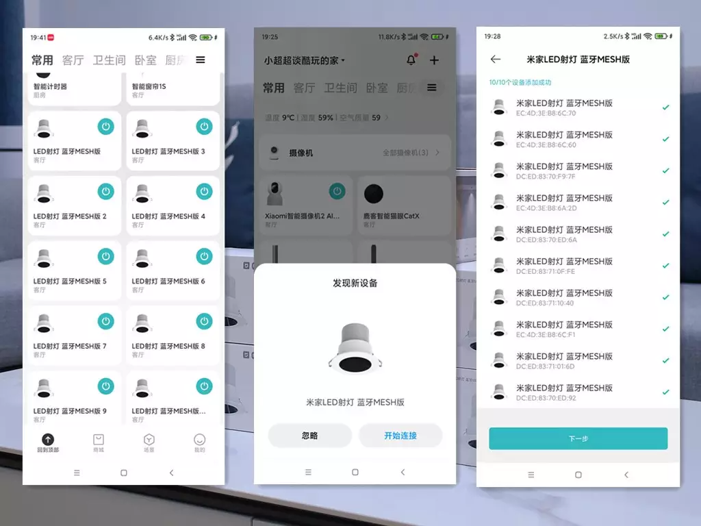 下面我来给大家讲讲关于米家APP方面的设定,首先是米家APP与米家LED射灯 蓝牙MESH版绑定连接,这个过程还是比较简单的,射灯通电状态下,APP会弹出绑定,我这次一共安装了10个射灯,可以在米家APP上一键批量绑定。