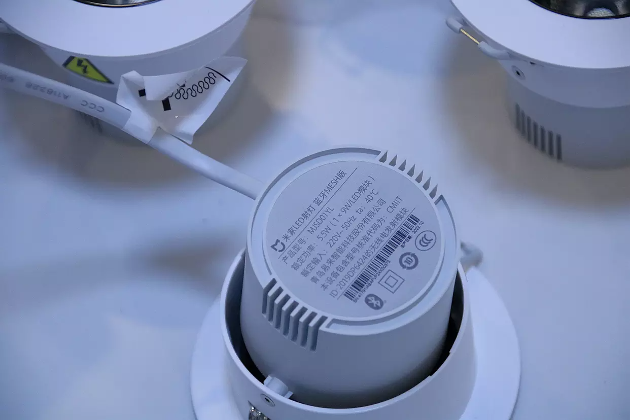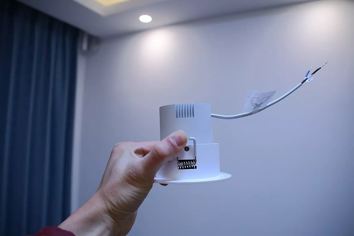 如果不确定电线有没有接好,安装到天花板里面时可以先打开电源确认一下,米家LED射灯 蓝牙MESH版正常亮起时,说明就搞定了,最后把弹簧卡扣拉起来塞进天花板圆孔中就可以了,这时我门可以用手指塞到面罩里面调节射灯的照射角度,米家LED射灯 蓝牙MESH版支持±25°调节。