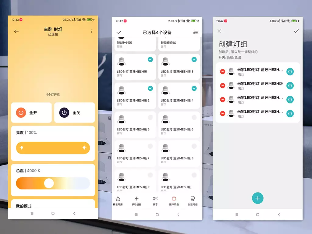 针对我这种一次安装毕竟多的米家LED射灯 蓝牙MESH版,米家APP上可以创建灯组来管理,比如我的客厅有5个,我把这5个创建一个灯组,我的主卧有4个,我把这四个创建一个灯组,这样日常使用时就比较好管理。