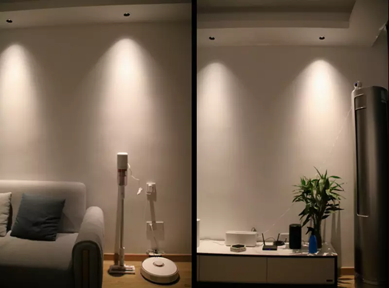 筒灯与射灯的机构设计不同,发不出来的光束也是有很多的区别,下面就是我特意做了一下对比,筒灯的照射范围很小,而射灯的范围就大很多,米家LED射灯 蓝牙MESH版的光束可以从墙面一直打到地板上,大家可以看一下我下面的对比图。