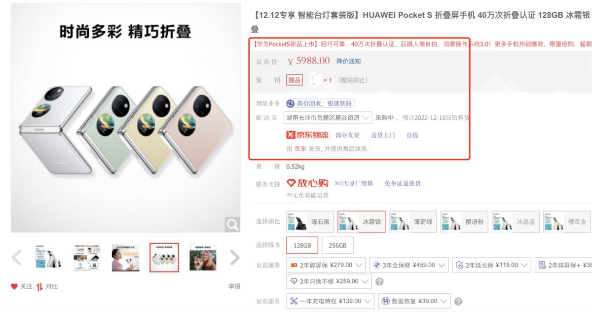 经笔者时间搜索后发现,华为Pocket S并没有网传的被全网下架。目前,华为官方商城、京东自营店、天猫旗舰店,华为Pocket S都可以正常下单。并且,双12活动期间,华为Pocket S还推出了双12套装版,赠送华为智选生态价值399元的智能台灯。