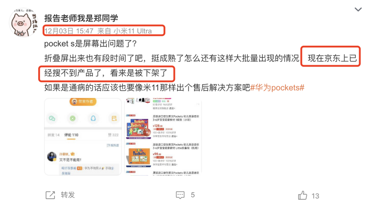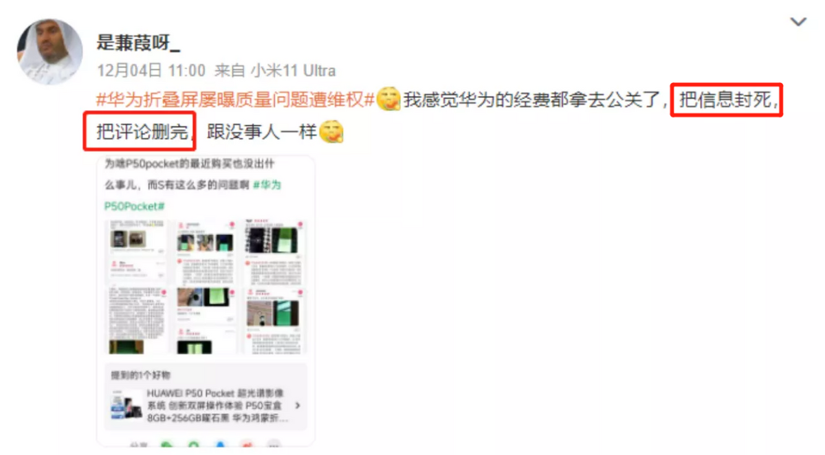 事实上,作为一个混迹于手机圈、数码圈多年的老司机,一眼就能闻出其中不正常的味道。用大白话说,华为Pocket S遭遇的“下架门”,本身就是一次彻彻底底、混淆视听的抹黑行动。首先,微博有很多大V,无中生有指出华为Pocket S下架,然后再用一个开售但未到货的商品,指出华为删掉了用户的评论,可以抹黑新款产品。