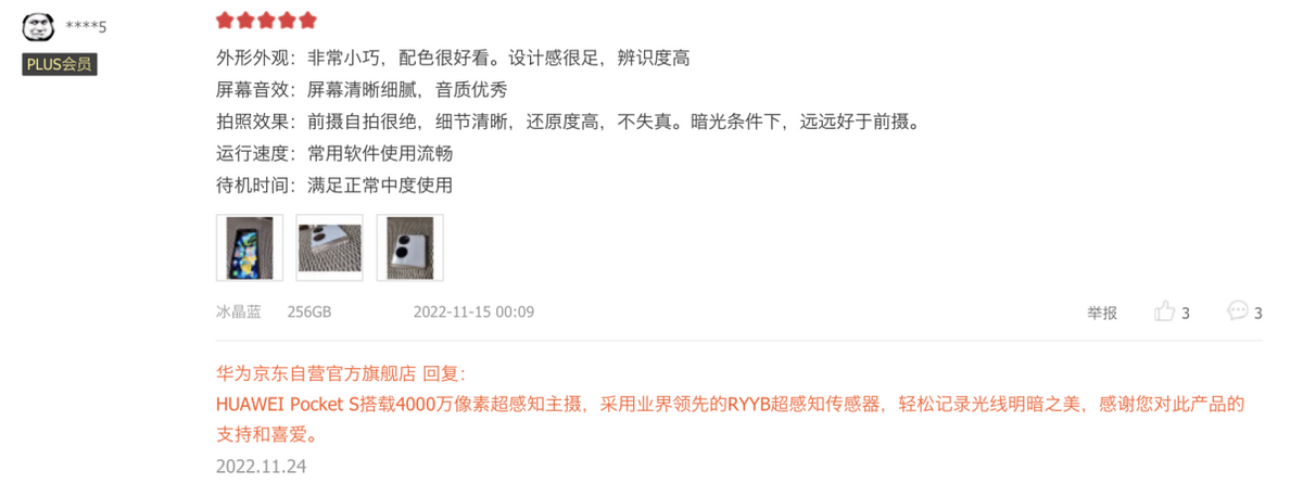 然后,华为也没有删除华为Pocket S的用户评价。无论是京东还是淘宝、天猫,都可以看到大量关于华为Pocket S的好评。即使是有一些差评,也属于个例,要么是因为疫情导致的物流配送慢,快递小哥不经过同意就把贵重物品放快递柜,要么就是买家下单的是绿色但商家发错了黑色。