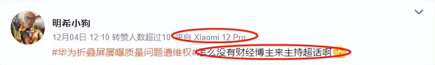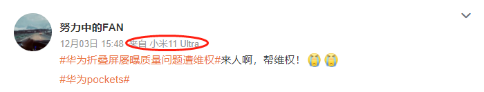 其次,如果你仔细观察他们发的内容,就会发现话术、口径基本出奇地一致,这很难不让人产生怀疑。此外他们微博客户端的小尾巴,也都出自同一个手机品牌,刚好这个手机品牌也出了折叠屏手机(但销量很一般),所以合理猜测这些品牌粉丝是想劝退不了解手机,但又想买华为Pocket S的潜在用户。如果这些用户没有去查证,大概率会被带节奏,转头去买了其他品牌的折叠屏产品。