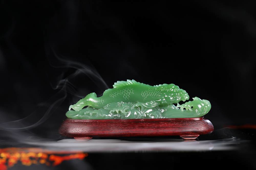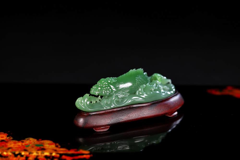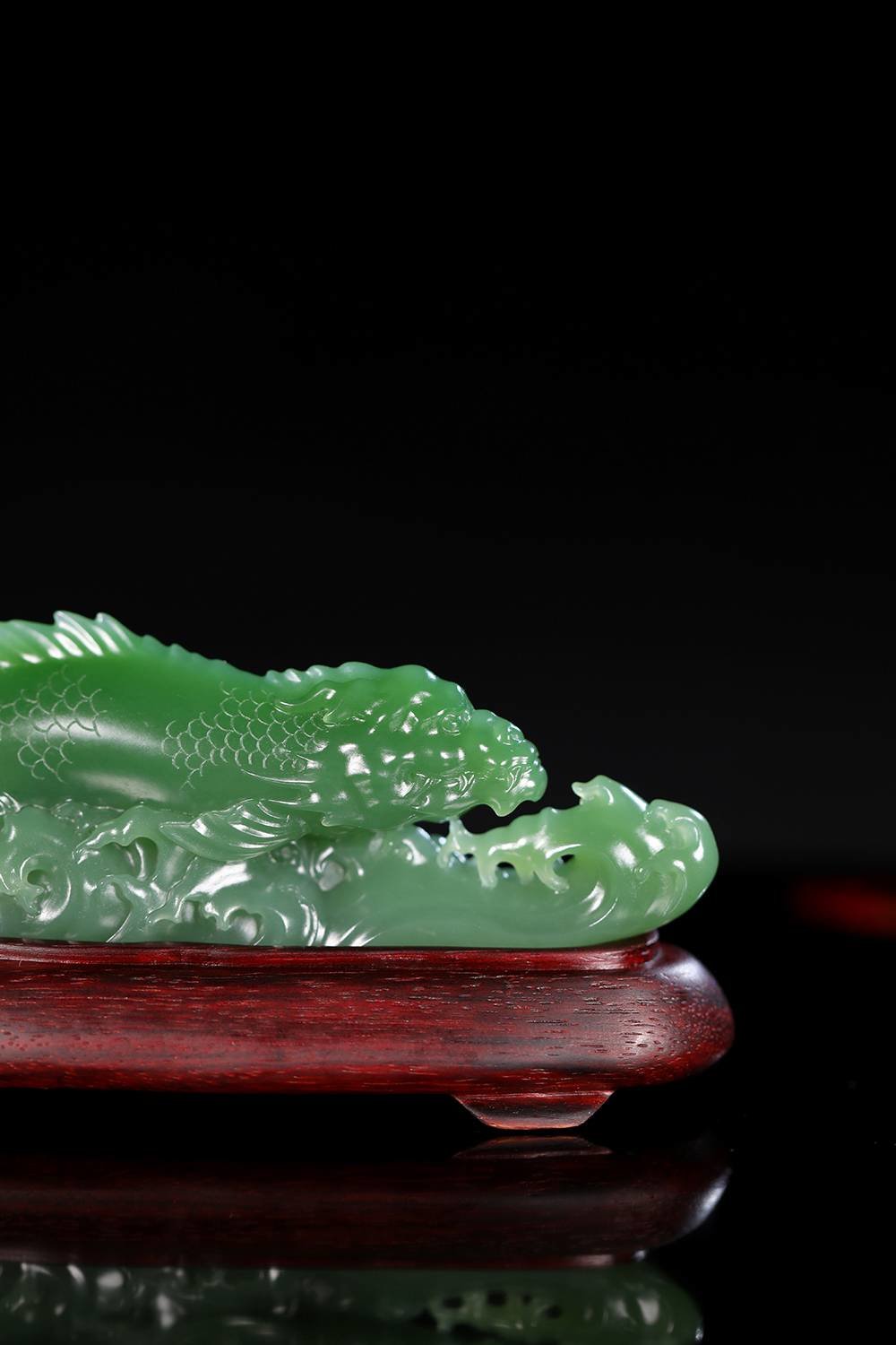 接下来,我们来看看本场精品拍的另一件碧玉作品《鳌龙》,玉质油润细泽,近过手电,以鱼化龙为创作题材,随玉色分布而琢,上部粉绿为鳌龙,下部粉青为海浪,结合多元技艺巧做,比例得当,薄厚有致,细工到位,线条流畅,以呈十足的立体感。