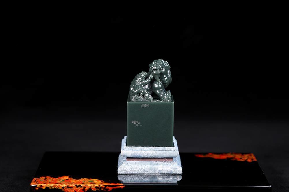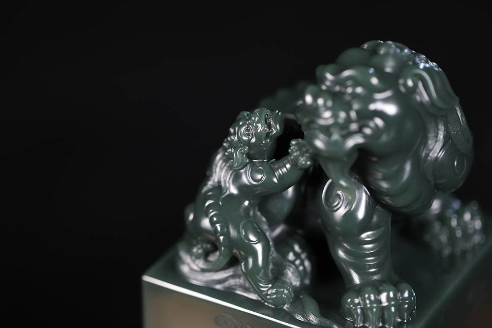 神兽题材的雕琢,除霸气磅礴外,亦有动态气韵之感,其中以玉狮题材为翘楚, 此件《瑞兽》印章,择优质青海青玉为材,玉质细腻凝润,玉色干净均匀,克重约857.7克,规格约为114*61*60.5mm,可日常使用,亦可收藏观赏。