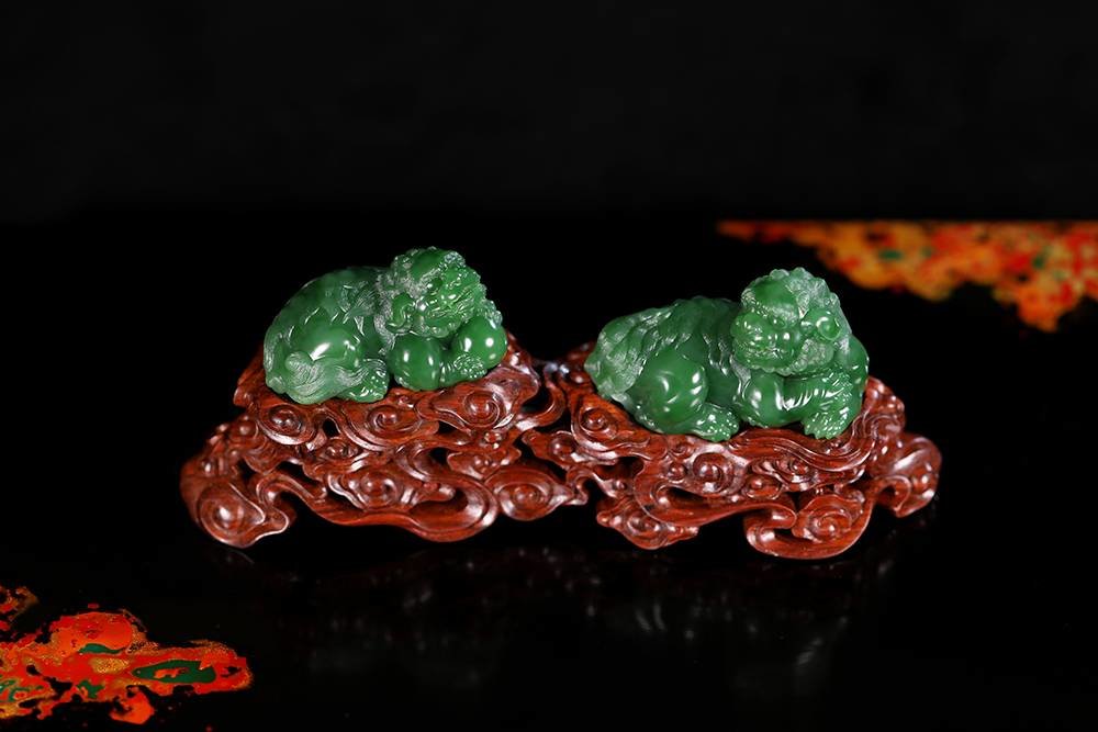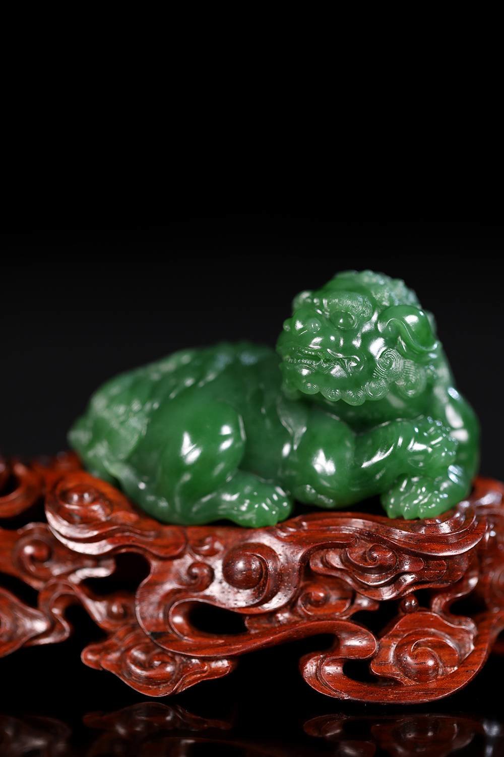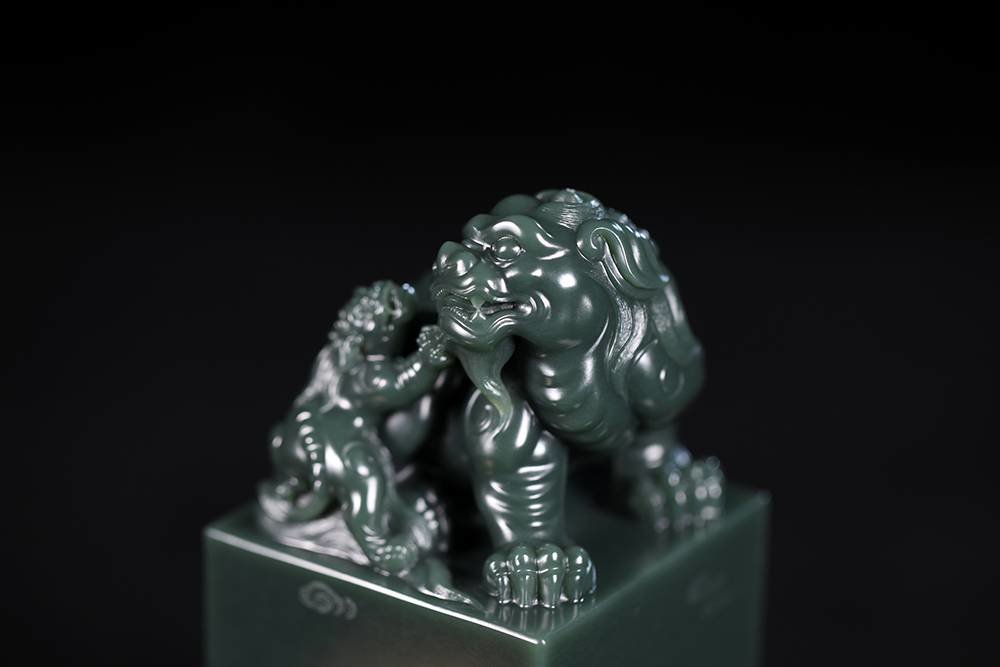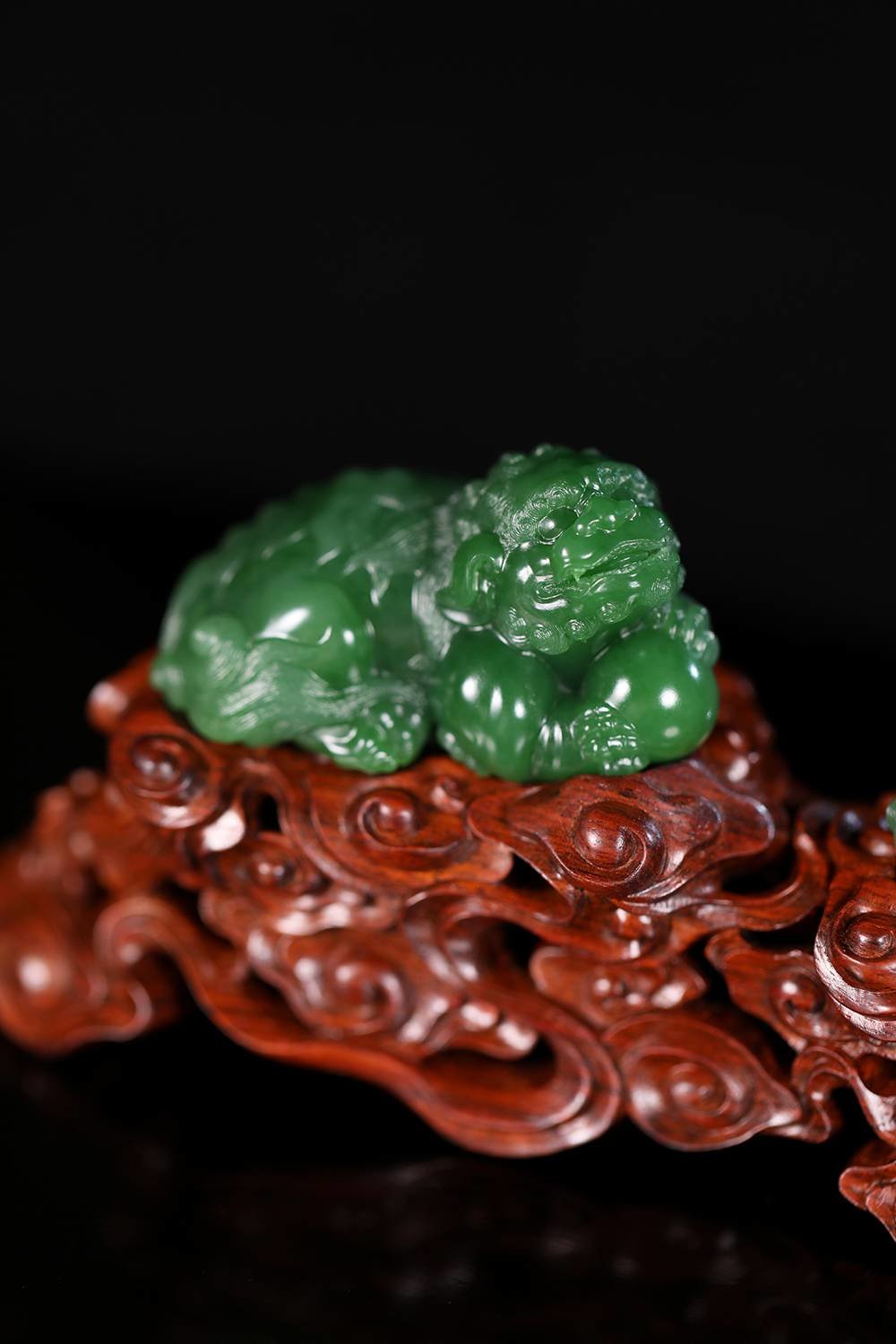 而同为玉狮题材,作品《狮子戏球》,以上乘俄罗斯碧玉为材,玉色亮丽吸睛,狮子灵动喜人,神态各异,以梳毛工艺巧做鬃毛,有点睛之妙意,神韵俱佳的开相、别出心裁的设计、收藏级的料子,如此结合让人印象深刻。
