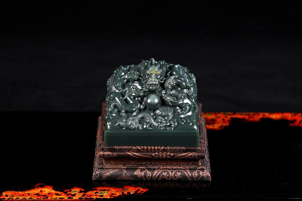 无规矩不成方圆,无规矩不成器,方章一直是玉雕创作的经典,印纽处将多种玉雕技法与特色相融于一体,雕琢五龙戏珠,工艺繁简有致,布局顺畅自然,结构张弛有度,整体大而不乱,气势磅礴,龙首处巧留矿皮,龙珠保留些许糖色,龙身盘桓,神韵灵动,一镌一刻之间,尽显磅礴霸气。