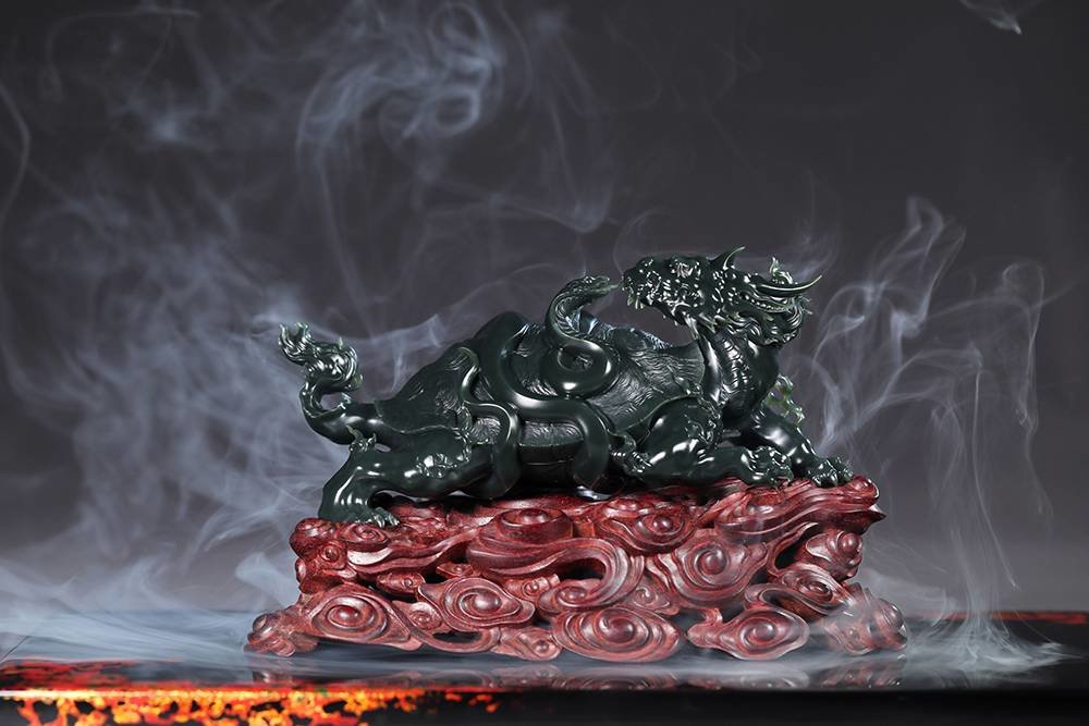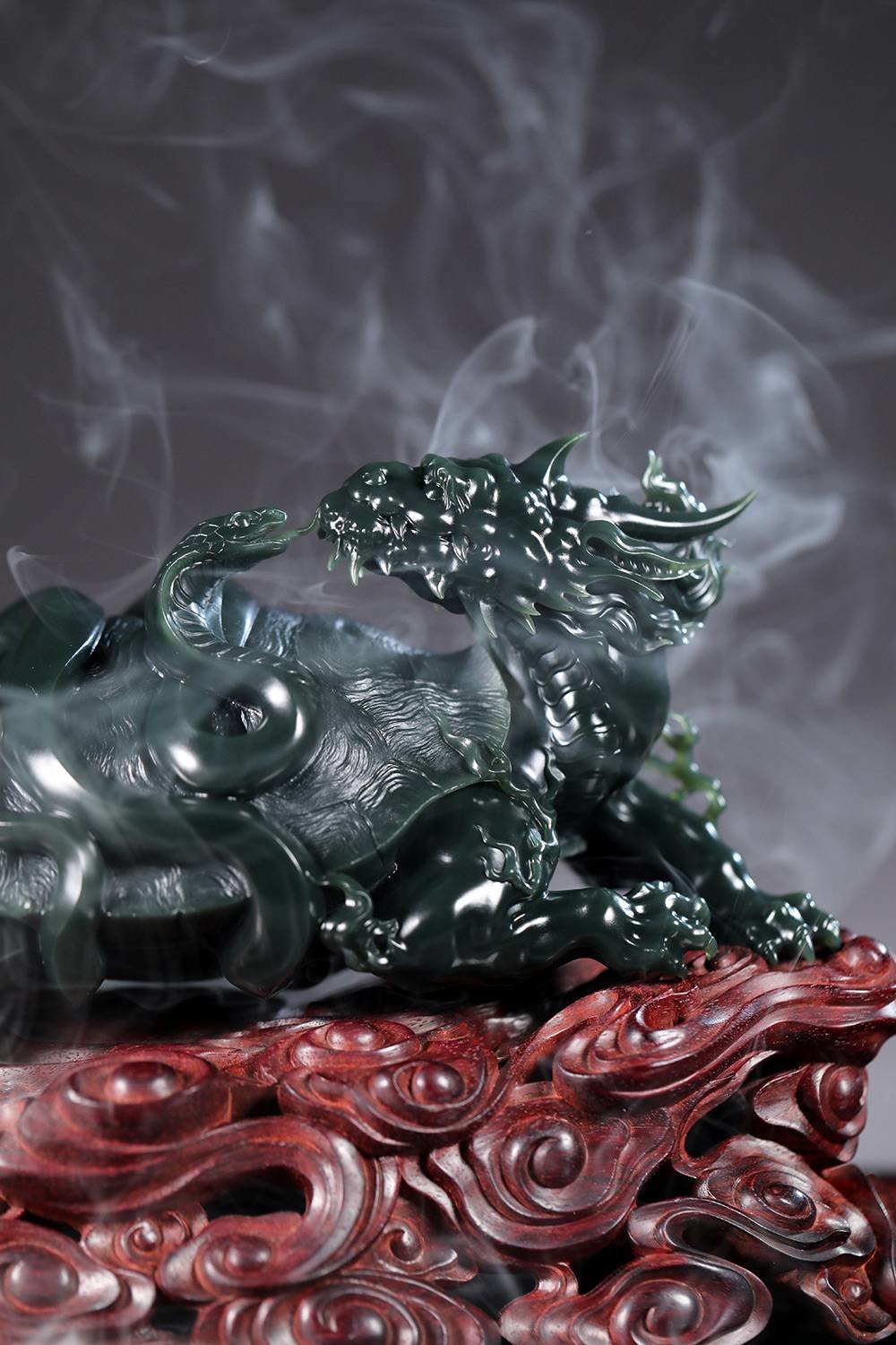同为青玉作品,摆件《玄武》巧琢背甲肌理感,写实生动,玄武开相,生猛霸气,蛇缠龟甲,力量感十足,极具画面感。
