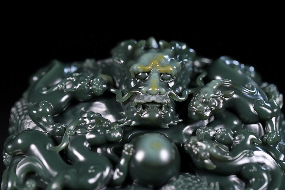 多元的玉材,表现出多元的造型美感,例如青玉和碧玉适合表现工艺的细致,技法的张弛有度,作品《五龙戏珠》,取材优质青海青玉,玉质细腻油润,局部留皮,整体约1859克重,规格约113*113*82mm,是本场的重器。