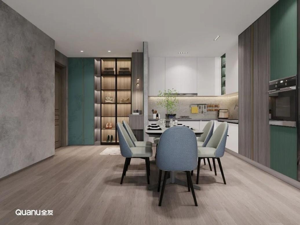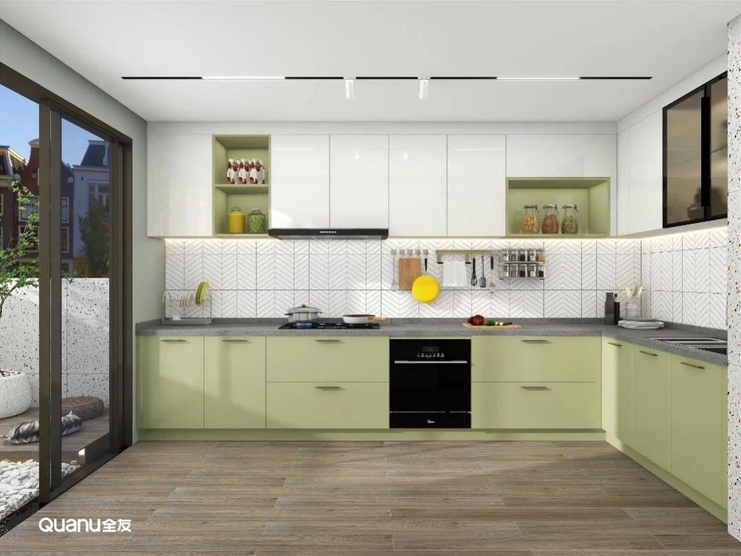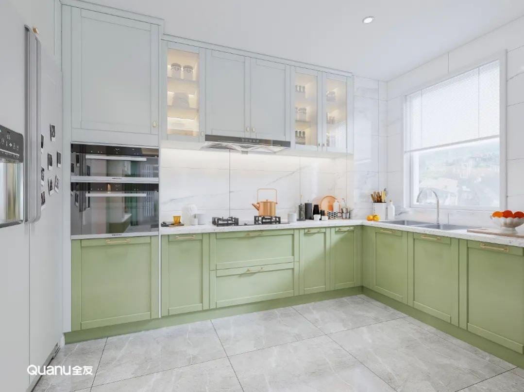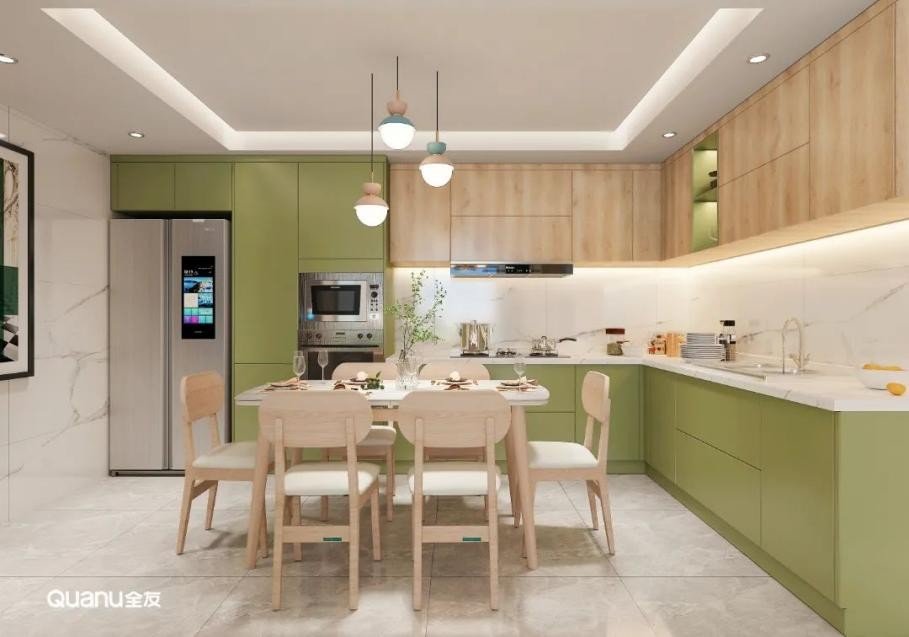 除了常见的白色、灰色和原木色,绿色也是厨房常见的颜色,而不同色调的绿色又可以营造出不一样的烹饪氛围。草绿色、豆绿色淡雅清新,不仅可以为被烟火气包裹的厨房空间注入自然的活力,还有助于情绪的调节与放松,让下厨更轻松自在。