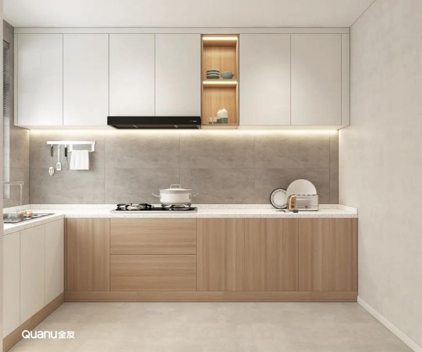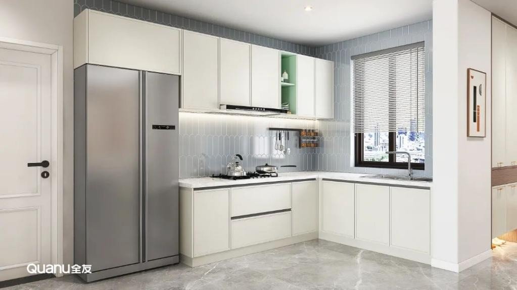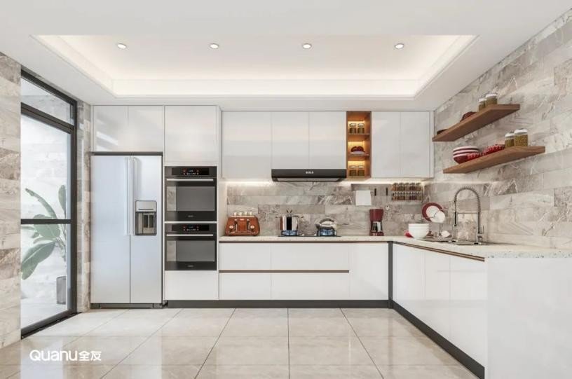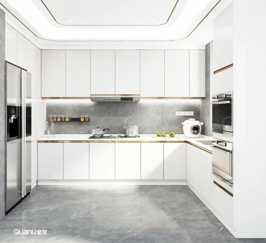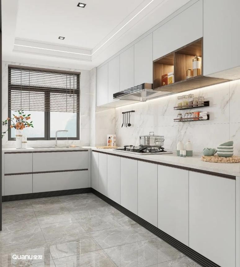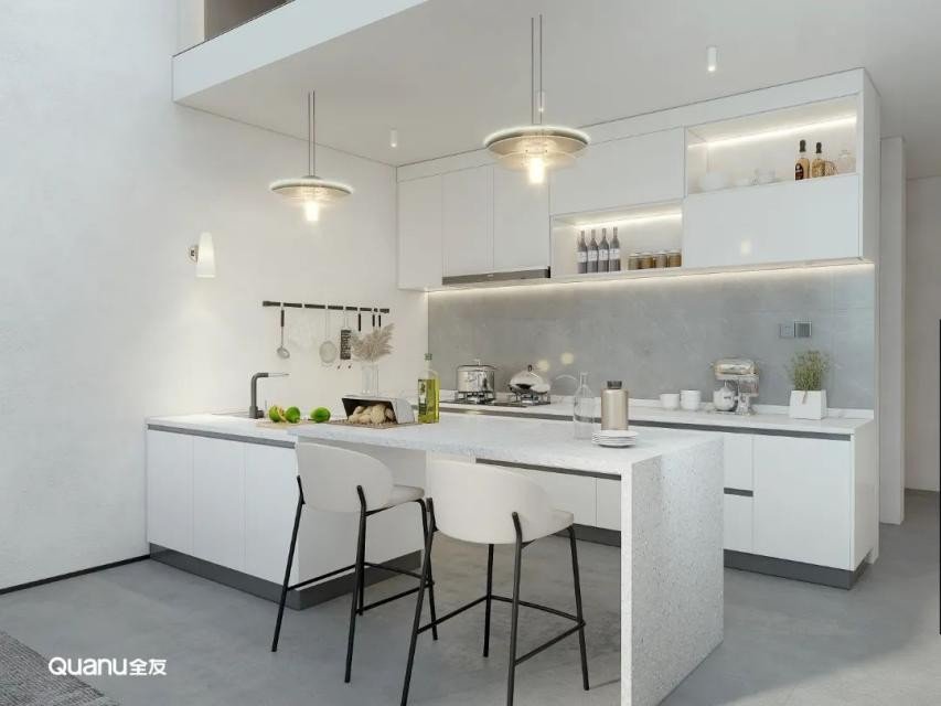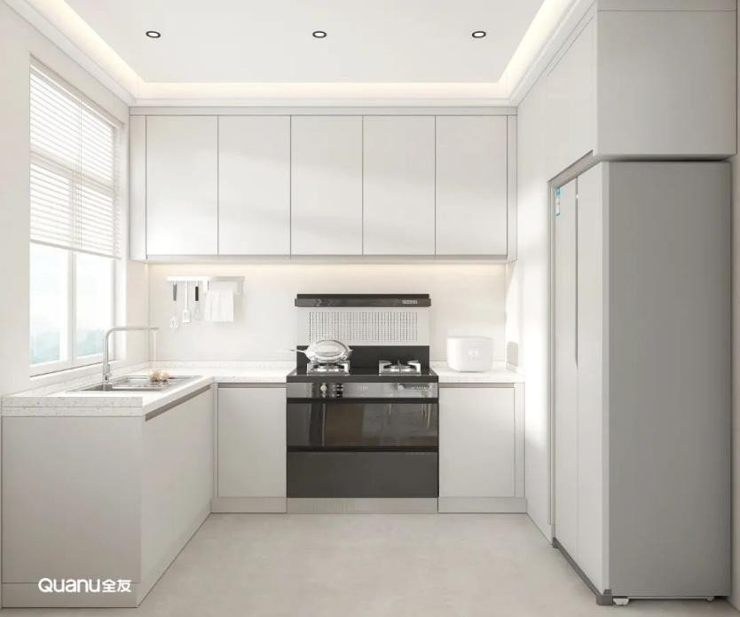 白色经典百搭,是大部分厨房设计的第一选择。白色的橱柜简约大气,搭配流畅的线条,在视觉上有延伸空间的效果,让整个厨房显得更明亮、宽敞、洁净。而且有一点污渍就能够马上看到,方便做完饭后及时清理,让厨房每天都保持干净整洁。