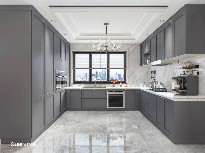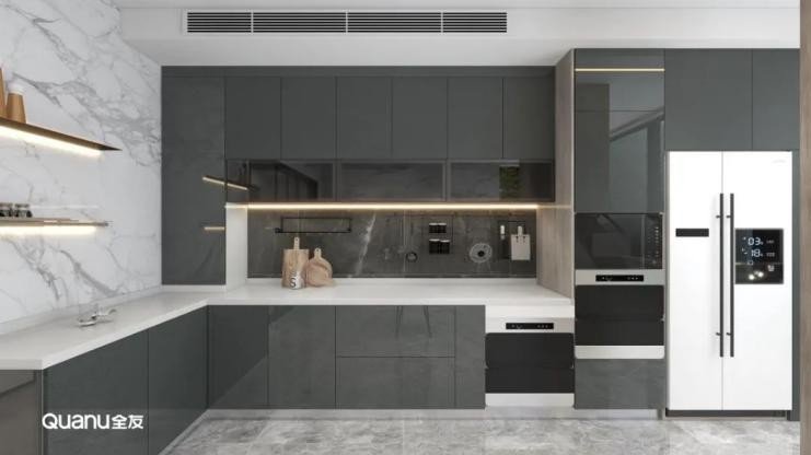 灰色时尚高级,现代感十足,用来装饰厨房也是不错的选择。大气的冷色调构筑了优雅的视觉美感,把艺术格调表现得淋漓尽致,其呈现出来的高端质感让厨房更显井然有序。相较于白色,灰色系厨房最大的优势就是耐脏,不管是尘土还是其它污渍,在灰色面前都不会太明显。