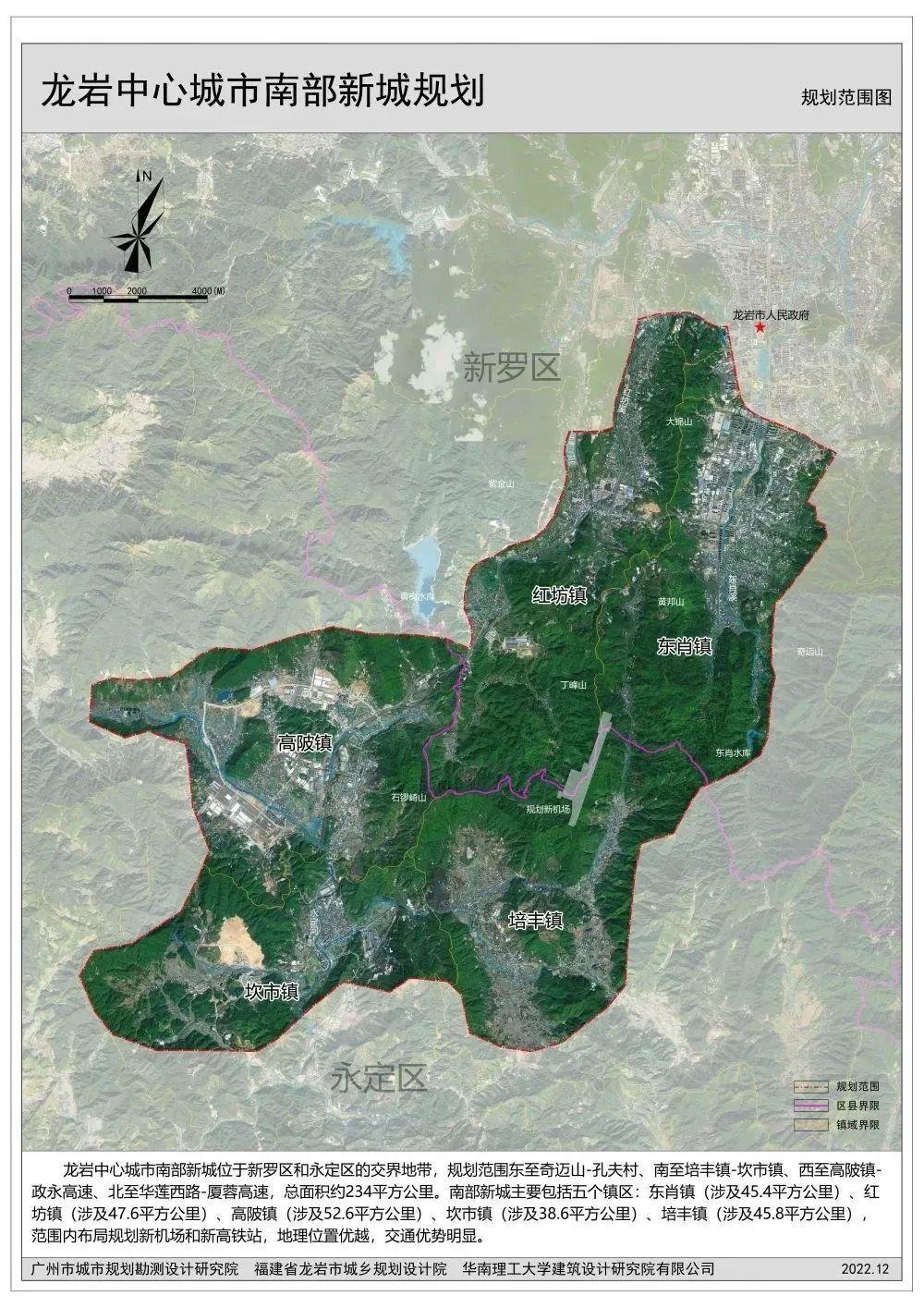 龙岩中心城市南部新城规划范围包括新罗区东肖镇、红坊镇和永定区高陂镇、培丰镇、坎市镇等5个镇的部分区域,总面积约234平方公里。