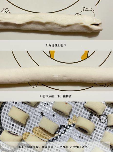 2:醒发好后案板上撒干面粉揉搓排气,擀成长条形饼,挤入豆沙馅