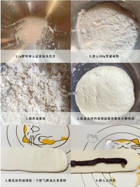 1:1g酵母加入适量温水化开,加入100g普通面粉搅拌成絮状揉成光滑