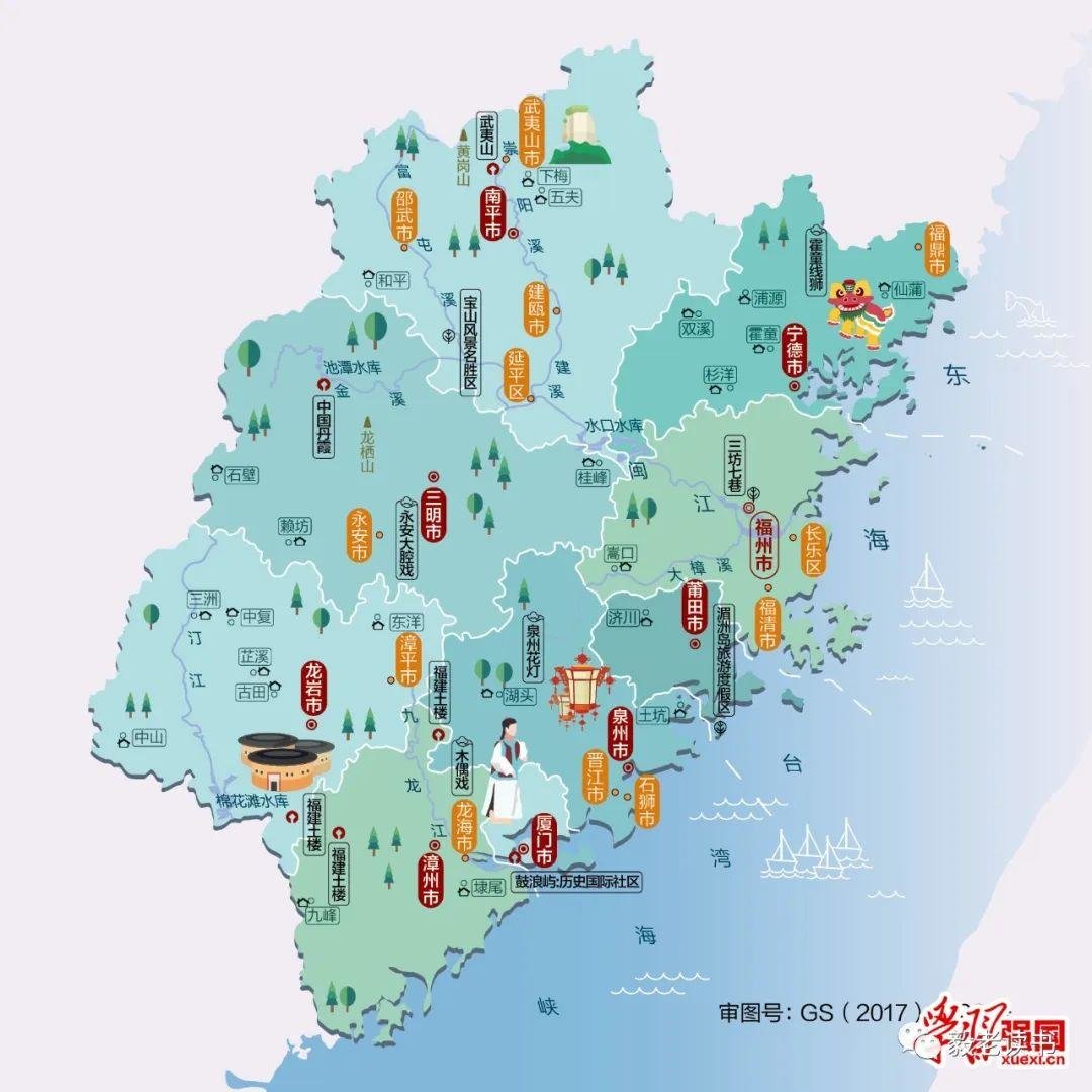 福建因九成陆地为山地丘陵地带,被称为“八山一水一分田”,森林覆盖率居全国第一。福建也是海上丝绸之路的起点之一,是海上商贸集散地,还是著名的侨乡,有海外华侨、华人千万人。境内著名景点有武夷山、湄洲岛、太姥山、鼓浪屿、桃源洞、玉华洞等。